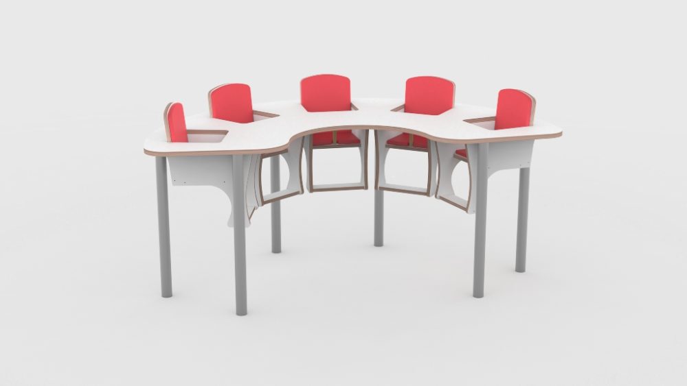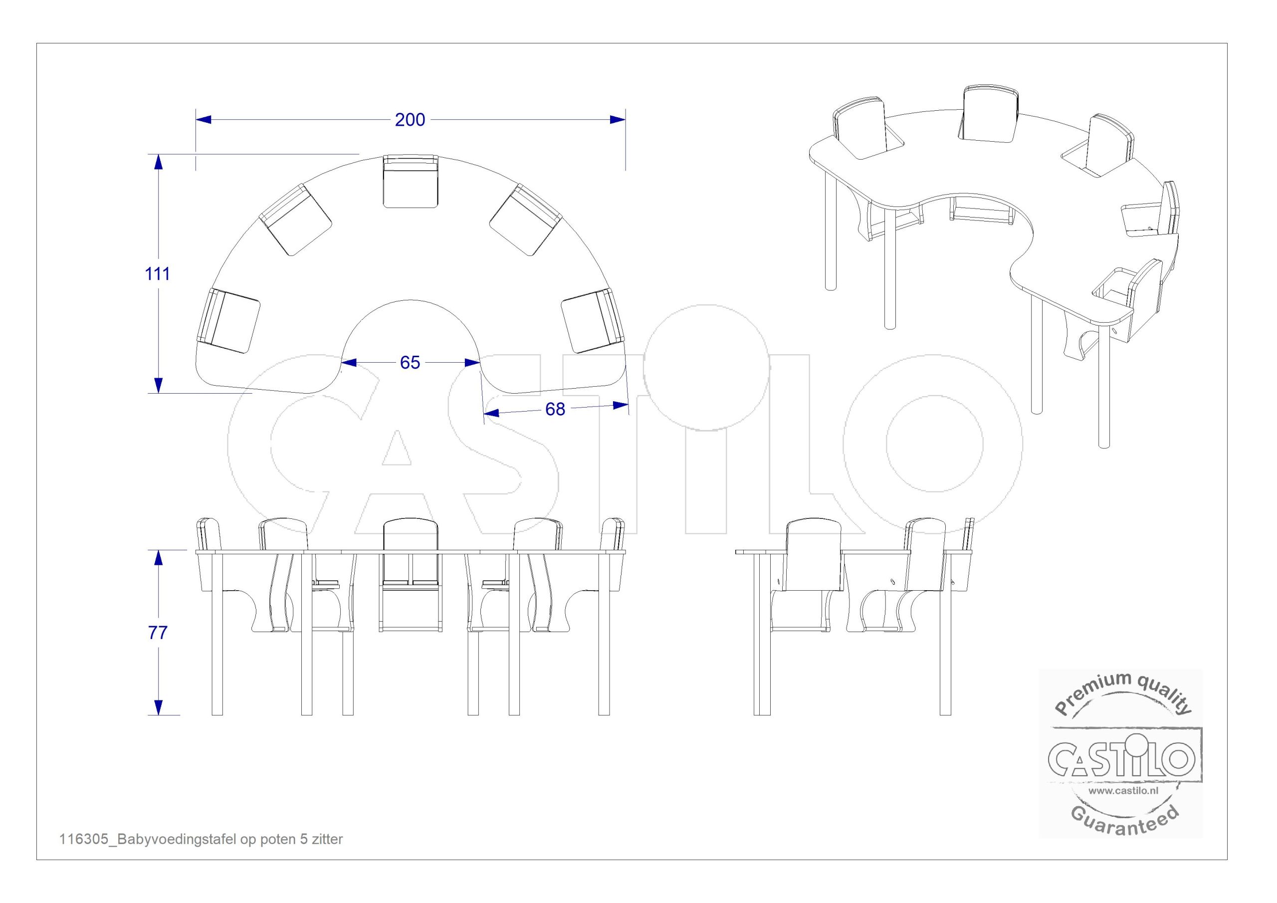 De 5-zitter op poten is de meest uitgebreide vaste voedingstafel van Castilo. Voor kinderdagverblijven met grotere babygroepen en een permanente inrichting biedt deze tafel vijf zitplaatsen in een solide, onwrikbare opstelling.