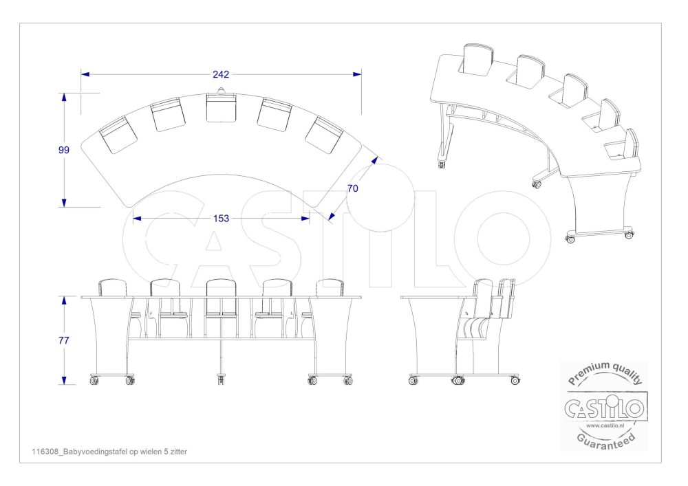 De 5-zitter op wielen is de ruimste verrijdbare variant uit de Castilo babyvoedingstafel-lijn. Voor grotere babygroepen biedt deze tafel de combinatie van capaciteit en mobiliteit: vijf baby’s tegelijk aan tafel, en de tafel is desgewenst eenvoudig te verplaatsen naar een andere plek in de ruimte.