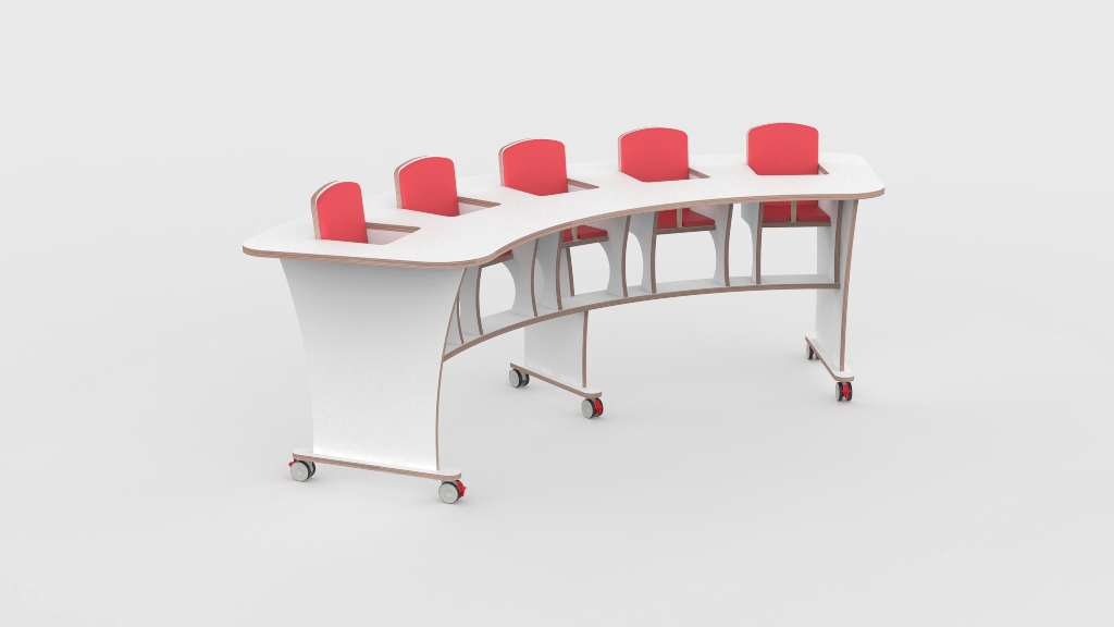 Grotere babygroepen vragen om meubels die daarmee meegaan. De 5-zitter op wielen biedt het team de mogelijkheid om in één ronde alle baby’s te voeden, zonder wisselingen en zonder wachten. Na het eten makkelijk opzij gerold, zodat de speelruimte direct vrij is. Elk kind zit veilig vast met een 4-punts gordeltje; stoelverkleiners zijn optioneel beschikbaar voor extra lichaamsondersteuning.