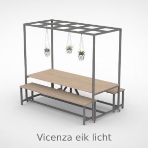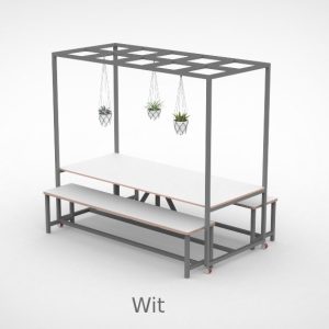 Het tafelblad is standaard wit HPL. Voor een houtdecor, zie keuzemenu