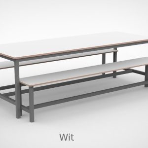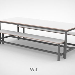 Het tafelblad is standaard wit HPL. Voor een houtdecor, zie keuzemenu