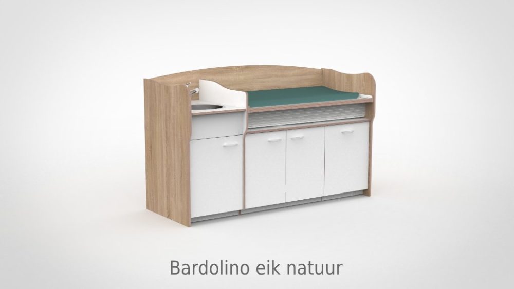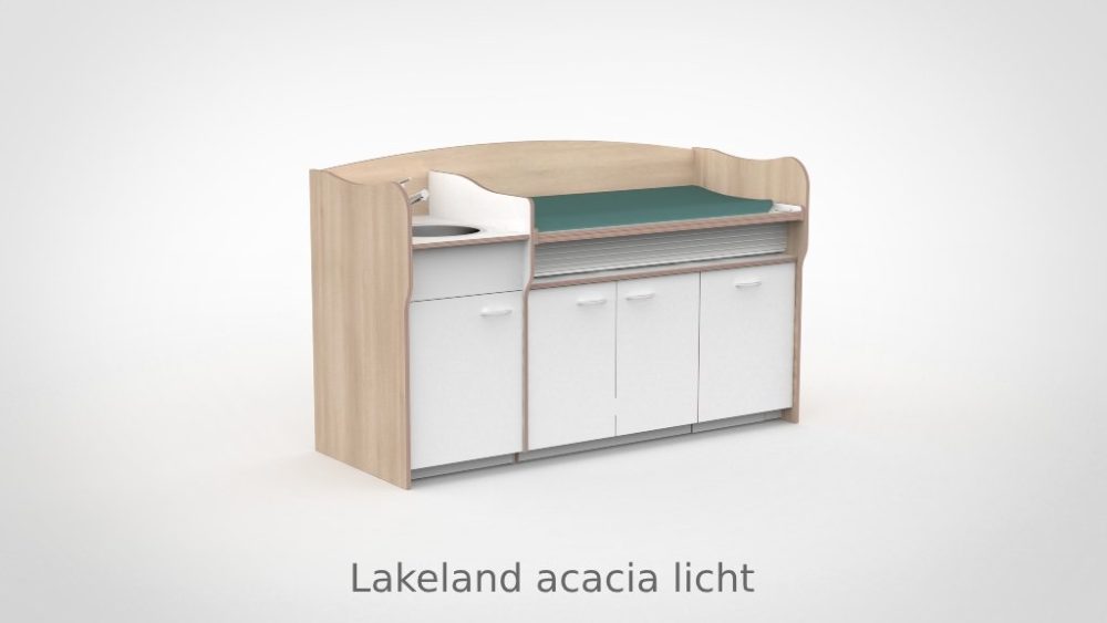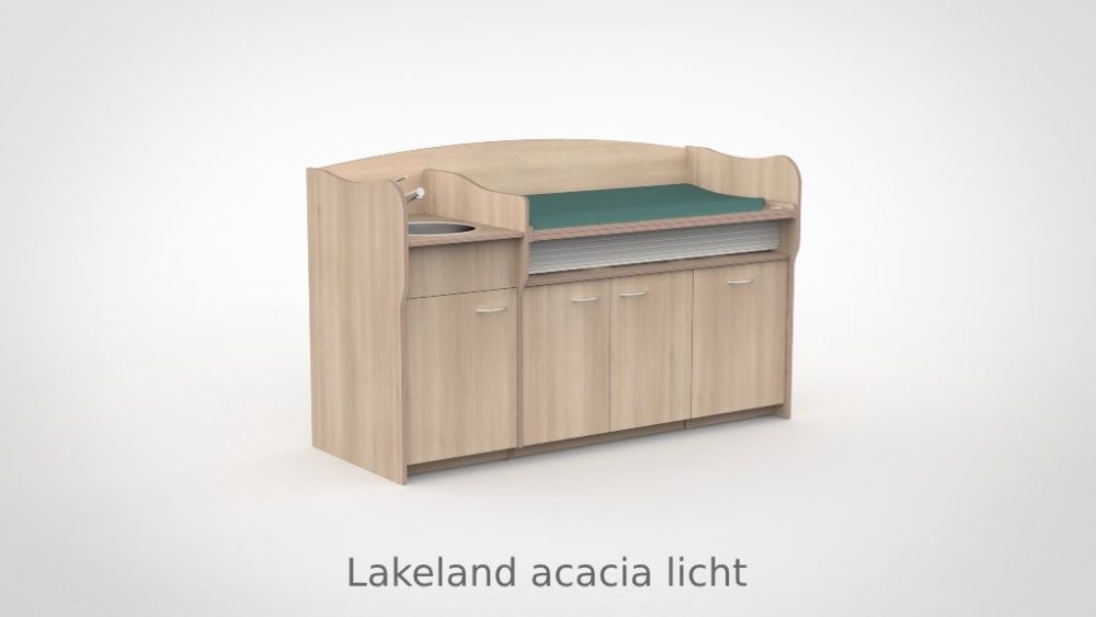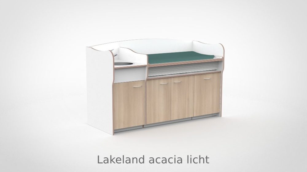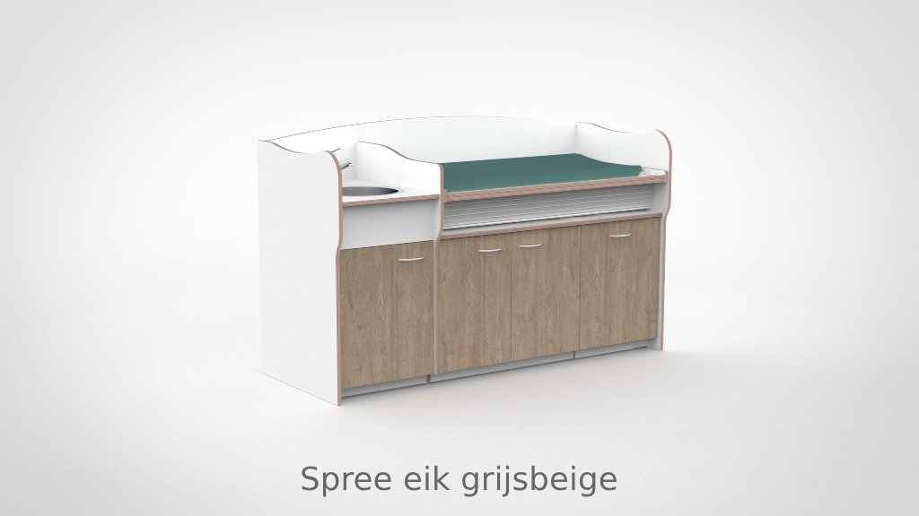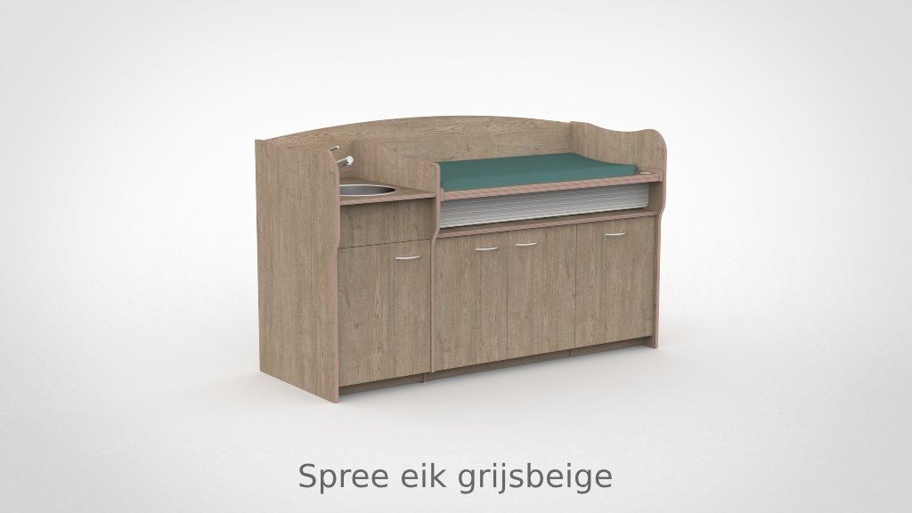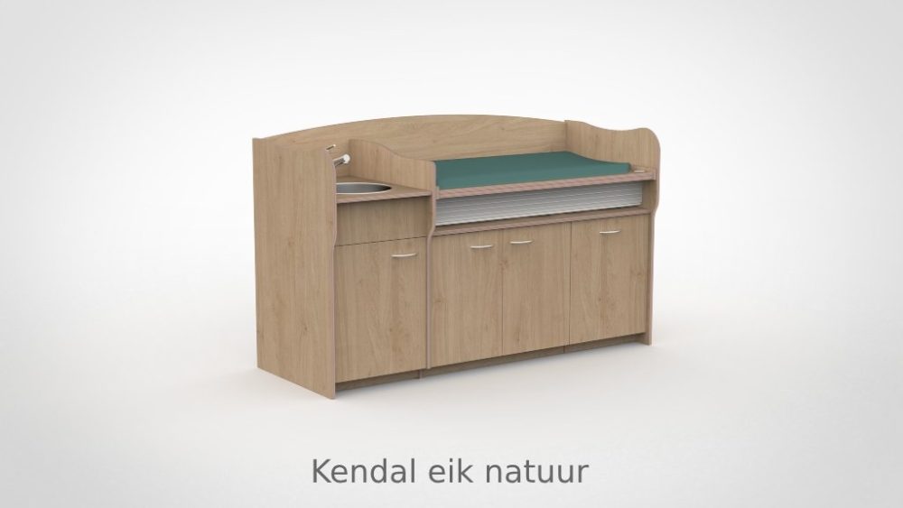 Op drukke babygroepen telt elk moment. De commode 200 cm maakt het mogelijk om twee verschoonmomenten tegelijk af te handelen, wat de werkdruk merkbaar verlaagt en de rust in de groep ten goede komt. Het werkblad is elektrisch verstelbaar van 85 tot 105 cm via twee elektrische zuilen op netstroom; tot drie persoonlijke werkhoogtes zijn per medewerker instelbaar via het touchpaneel met LED-display en kinderslot onder het blad. De spoelbak is ingefreesd en beweegt automatisch mee. Een rolluik sluit de tussenruimte tussen blad en onderkast netjes af bij elke stand. De opbergruimte achter de deuren houdt al het benodigde materiaal overzichtelijk bij de hand.