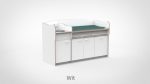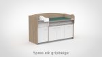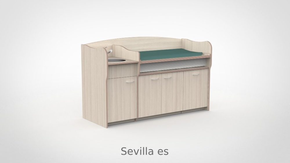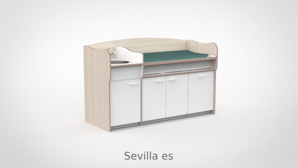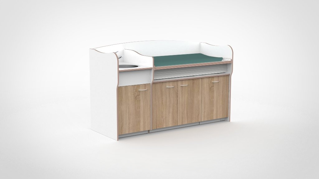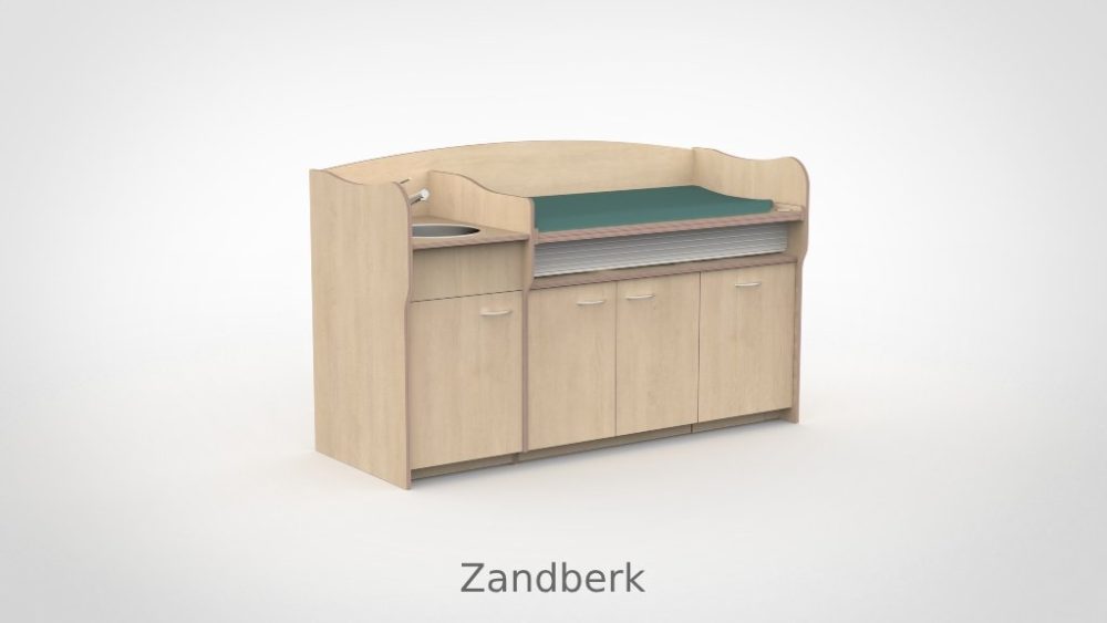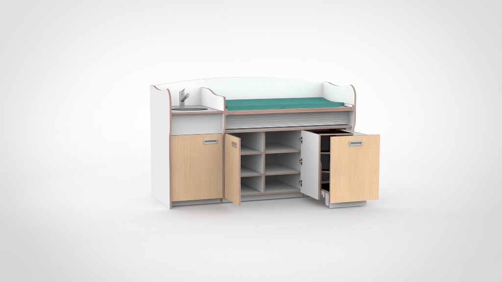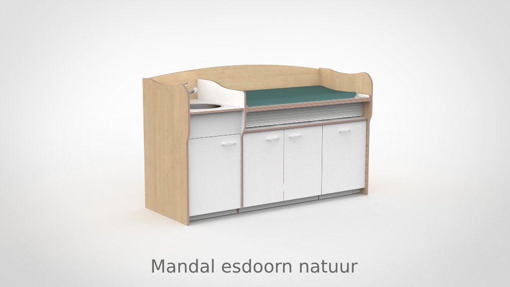 Op drukke babygroepen telt elk moment. De commode 200 cm maakt het mogelijk om twee verschoonmomenten tegelijk af te handelen, wat de werkdruk merkbaar verlaagt en de rust in de groep ten goede komt. Het werkblad is elektrisch verstelbaar van 85 tot 105 cm via twee elektrische zuilen op netstroom; tot drie persoonlijke werkhoogtes zijn per medewerker instelbaar via het touchpaneel met LED-display en kinderslot onder het blad. De spoelbak is ingefreesd en beweegt automatisch mee. Een rolluik sluit de tussenruimte tussen blad en onderkast netjes af bij elke stand. De opbergruimte achter de deuren houdt al het benodigde materiaal overzichtelijk bij de hand.