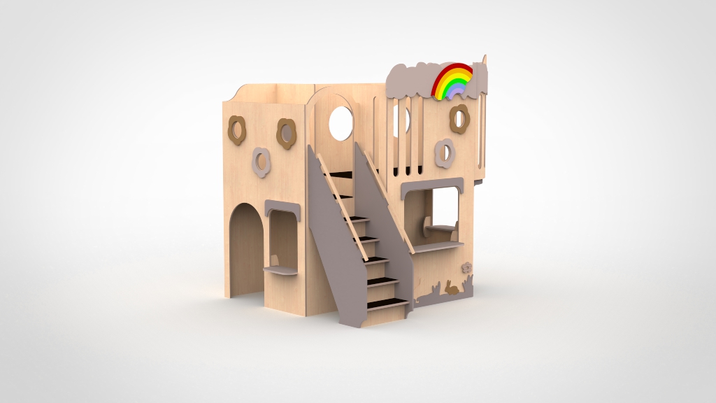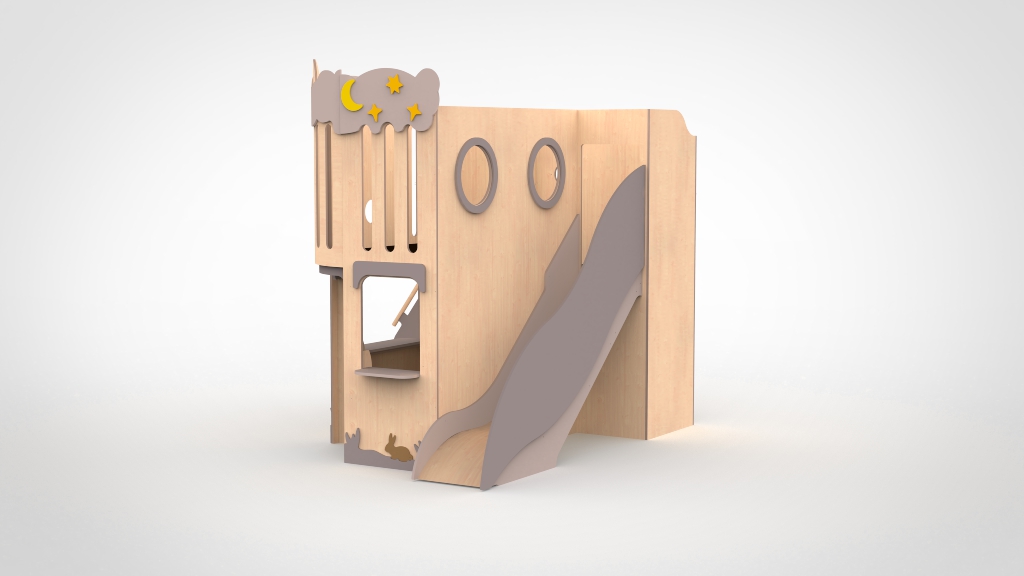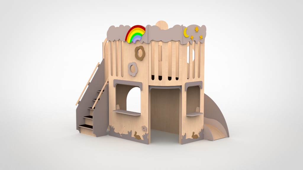 Vervaardigd van FSC-gecertificeerd berkenmultiplex, afgewerkt met VOS-vrije lak op waterbasis. Decoratieve details vlak afgewerkt zonder uitstekende delen. Antislipcoating op traptreden en platformvloer. Gecertificeerd conform EN 1176. Let op: bij platformhoogte boven 60 cm is een landingsmat verplicht — verkrijgbaar in diverse kleuren.
