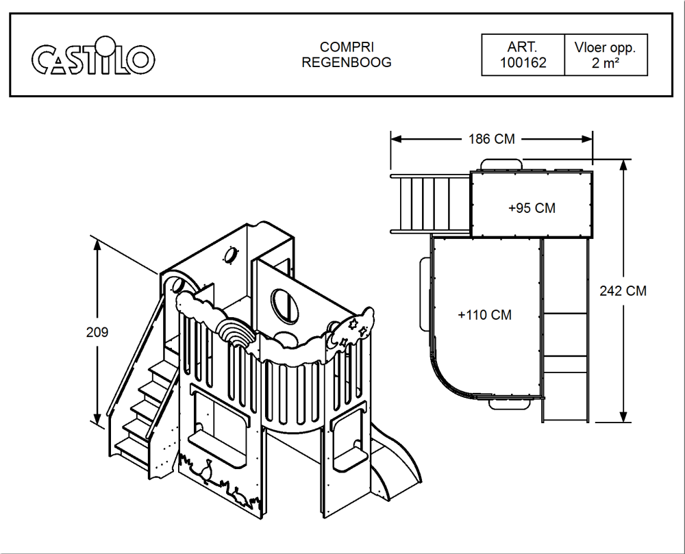 Geschikt voor kinderen van 3 tot 6 jaar. Footprint [X × X] cm, vloeroppervlak [X] m². Elk kleuronderdeel afzonderlijk in te stellen. Montage inbegrepen, levering door heel Nederland.