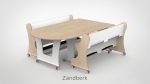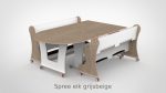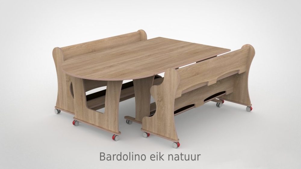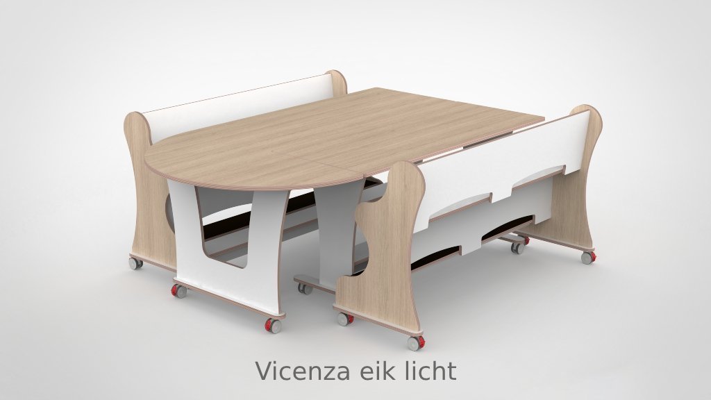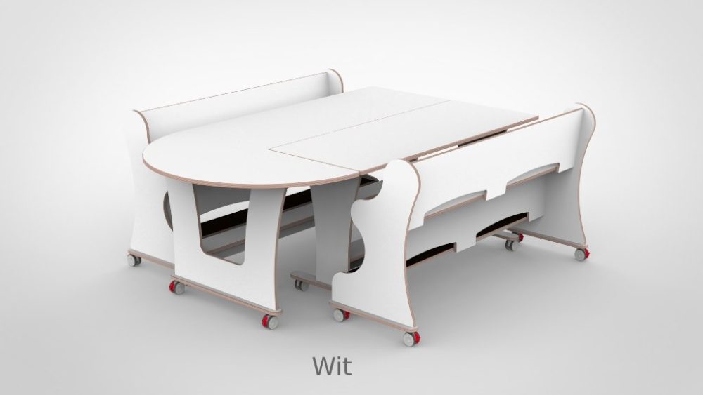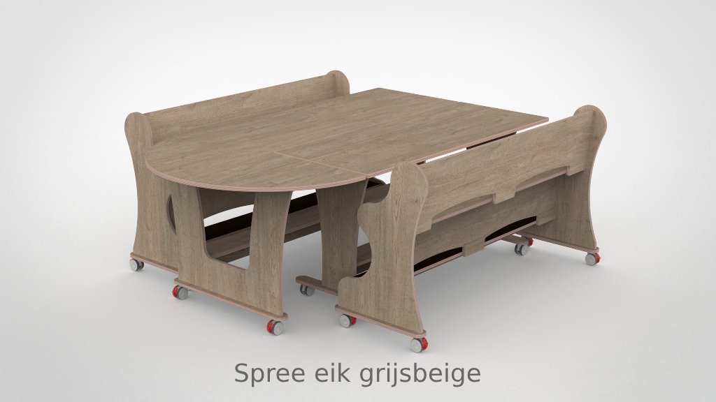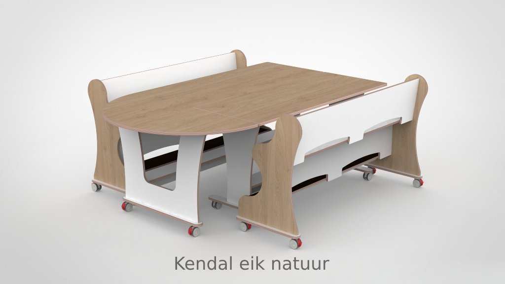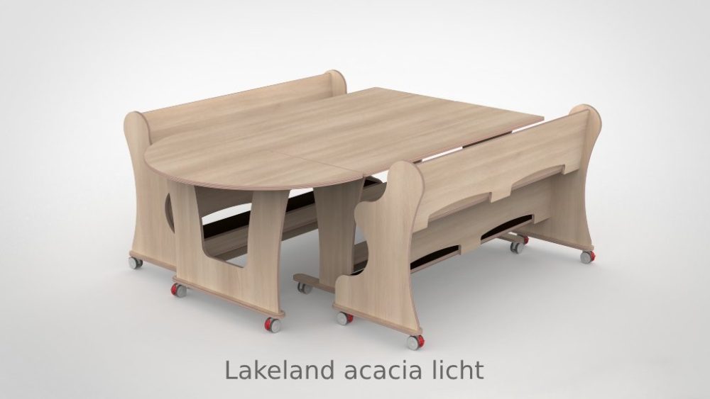 Tafel en banken zijn vervaardigd uit 18 mm FSC-gecertificeerd berkenmultiplex met een slijtvaste witte HPL-toplaag. Bestand tegen intensief dagelijks gebruik en eenvoudig schoon te houden. Het meubilair voldoet aan de geldende eisen voor meubilair in de kinderopvang. De vier zwenkwielen zijn voorzien van een dubbele rem.