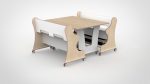 Het meest complete werkvlak voor een kleine groep — tafel en twee banken met dubbele voetenplank en magneetkoppeling, gemonteerd geleverd.