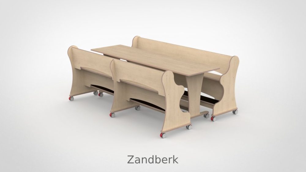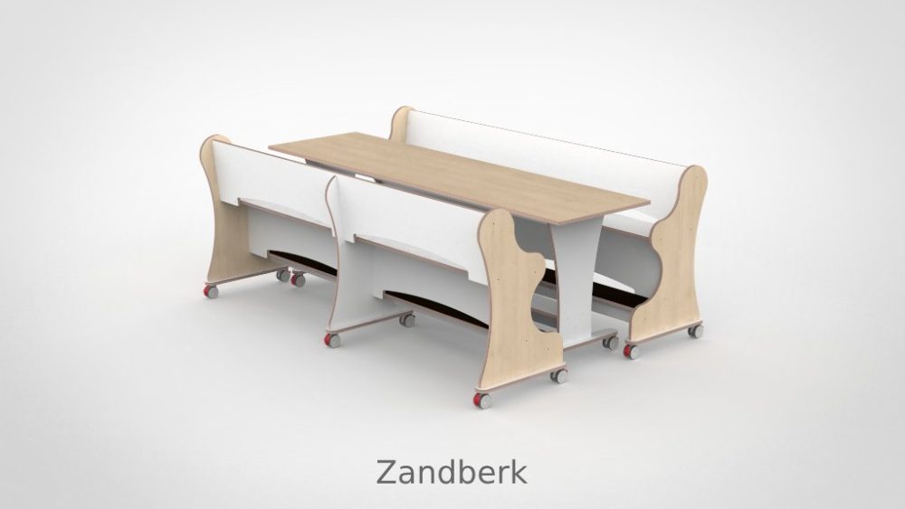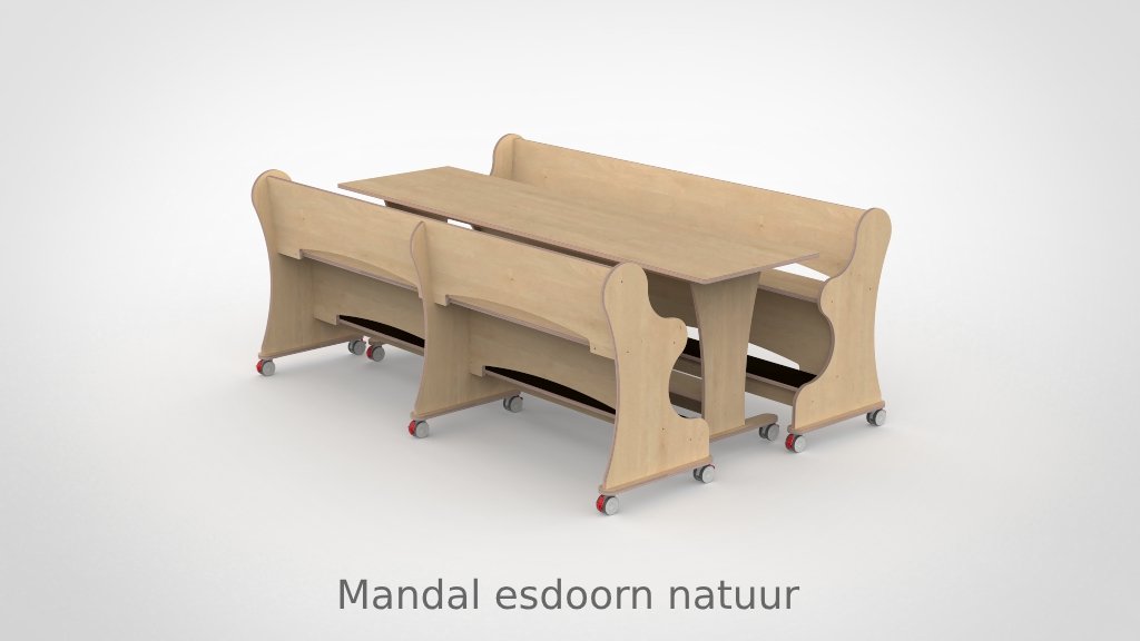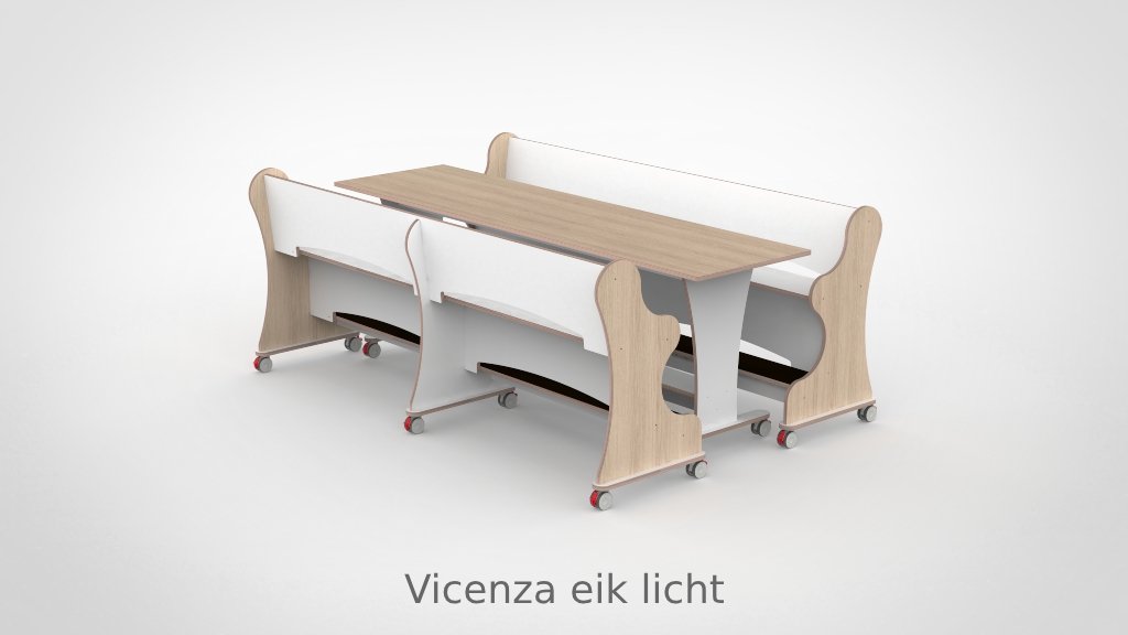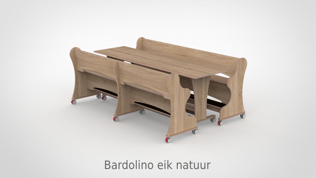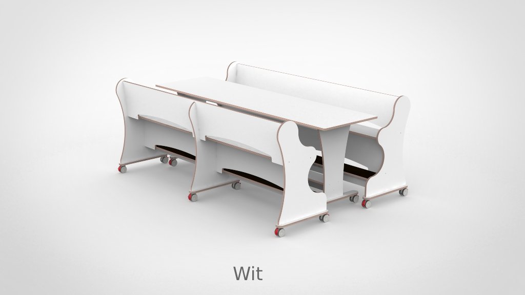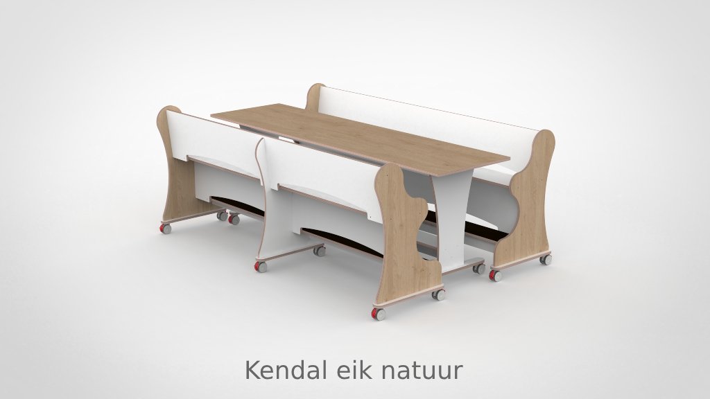 Met een bank aan elke kant van de tafel biedt de dubbel de meeste capaciteit per opstelling. Kinderen zitten aan beide zijden; de PM begeleidt vanuit de kopse kant of staat naast de tafel en heeft dankzij de 60 cm tafeldiepte elk kind aan beide kanten direct in het oog. Geen kind zit buiten bereik, ook niet in een volle opstelling.