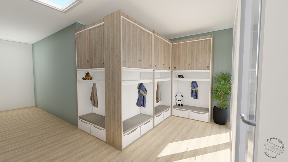 - Verrijdbare bakken onderaan voor schoenen en persoonlijke spullen