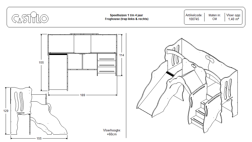 Wat de Froghouse bijzonder maakt, is de verhouding tussen speelwaarde en ruimtegebruik. Het toestel biedt een compleet speellandschap — klimmen, glijden, doorkruipen en fantasiespel — op een verrassend compact vloeroppervlak. Ideaal voor kinderopvanglocaties die groot willen spelen zonder dat het toestel de hele ruimte in beslag neemt.
