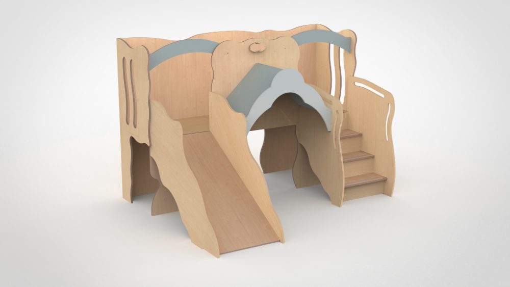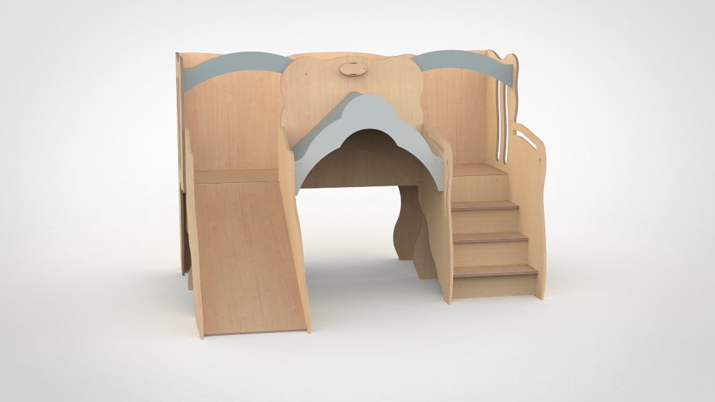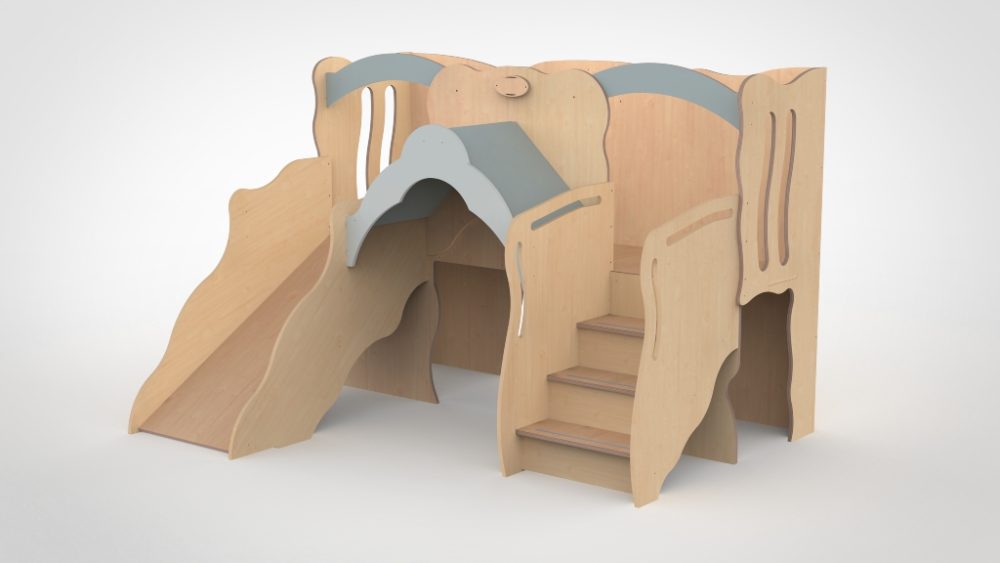 Vervaardigd van FSC-gecertificeerd berkenmultiplex, afgewerkt met VOS-vrije lak op waterbasis. De organische vormen zijn zorgvuldig afgewerkt zonder scherpe randen. Antislipcoating op traptreden en vloer. Gecertificeerd conform EN 1176.