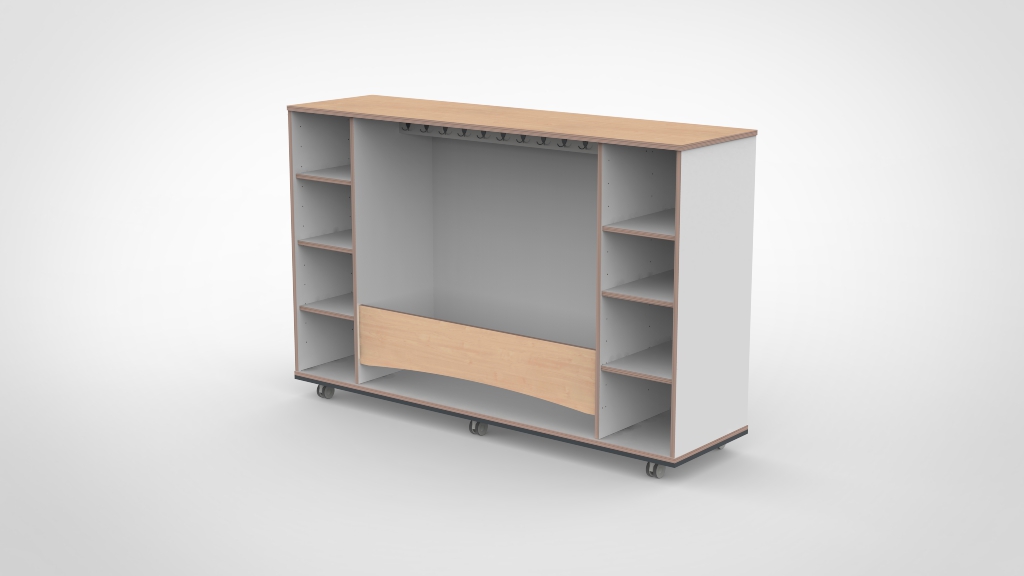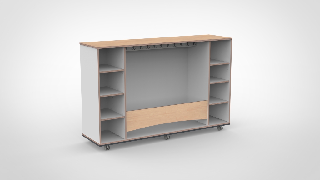 Mobiele garderobe met kapstok en opbergvakken aan beide zijden. De meest complete variant uit het garderobe kasten-assortiment, met maximale bergruimte voor elke groepsruimte.