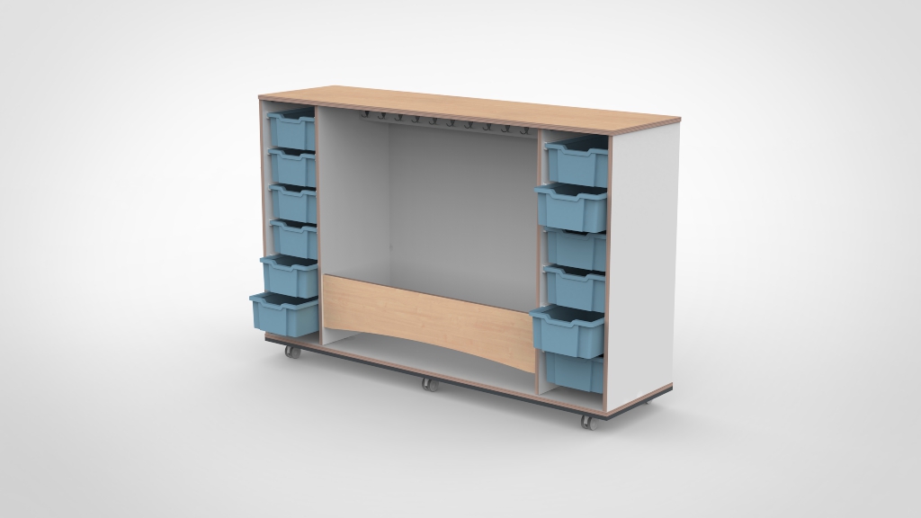 Mobiele garderobe met kapstok en Gratnells laden aan beide zijden. De meest complete variant met maximale gesloten opbergruimte, waar elk kind een eigen lade heeft voor persoonlijke spullen.
