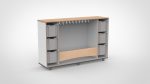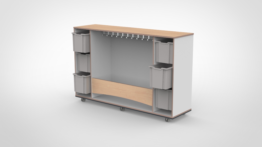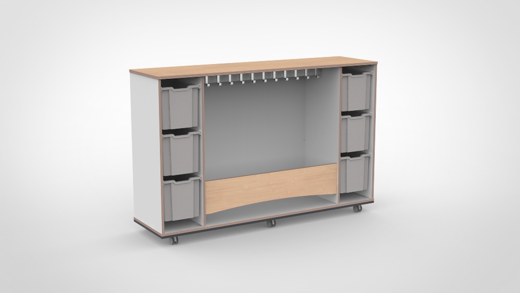 Mobiele garderobe met kapstok en kleinere Gratnells laden aan beide zijden. De meest complete variant met compacte laden, ideaal wanneer u veel kinderen een eigen opbergplek wilt bieden.