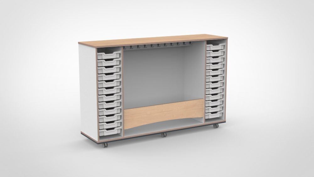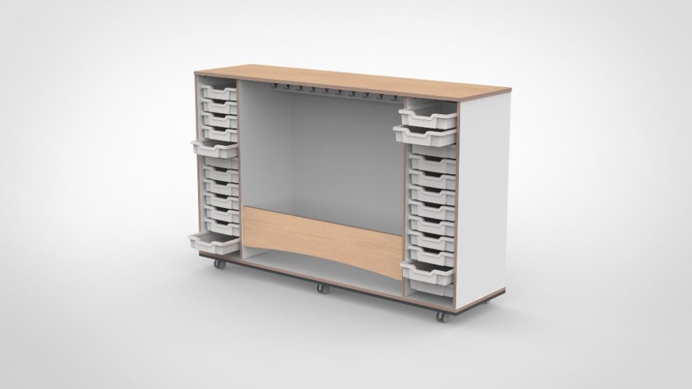 De constructie is vervaardigd uit hoogwaardig multiplex met een slijtvaste HPL-afwerking die bestand is tegen intensief dagelijks gebruik en eenvoudig schoon te houden is. Zwenkwielen met rem maken de garderobe eenvoudig verplaatsbaar. Bovenblad en tussenplank zijn verkrijgbaar in verschillende decors.