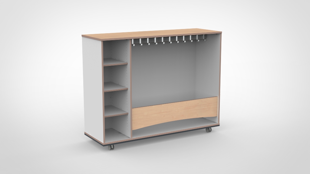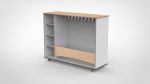 Mobiele garderobe met kapstok en 4 open opbergvakken aan de linkerzijde. Kinderen hangen hun jas op en hebben een eigen vak voor laarzen, tas en persoonlijke spullen.