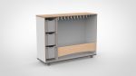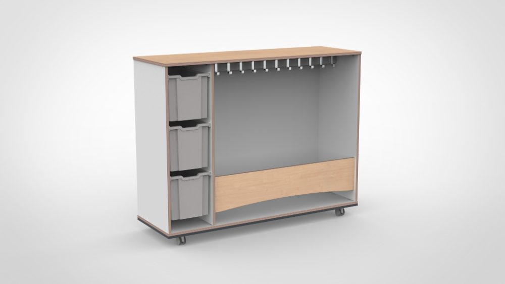Mobiele garderobe met kapstok en Gratnells laden aan de linkerzijde. De laden bieden gesloten opbergruimte voor een georganiseerde garderobe waar elk kind zijn eigen plek heeft.