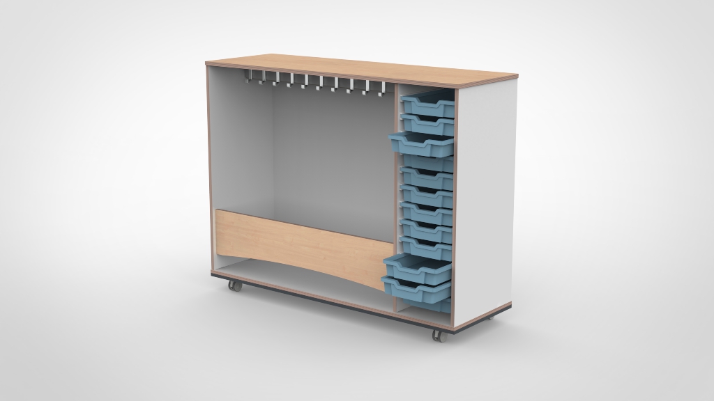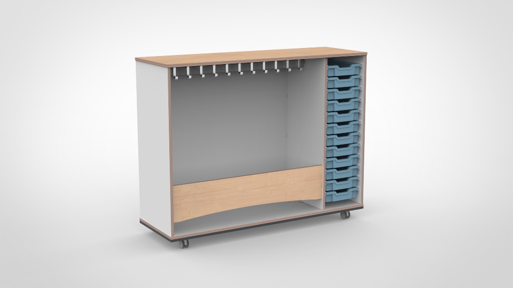 Mobiele garderobe met kapstok en een combinatie van Gratnells laden aan de rechterzijde. De mix van grote en kleine laden biedt flexibele opbergruimte voor uiteenlopende spullen.