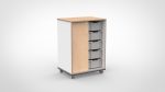 Vervaardigd uit 18 mm dik meubelpaneel met slijtvaste melamine afwerking. Alle randen zijn voorzien van een 2 mm ABS-afwerking die stoot- en slijtvast is. Deuren zijn voorzien van zachtsluitende scharnieren. Het meubel voldoet aan de geldende veiligheidsnormen voor gebruik in de kinderopvang. Verkrijgbaar in negen houtdecors met een apart te kiezen kleur voor het bovenblad.