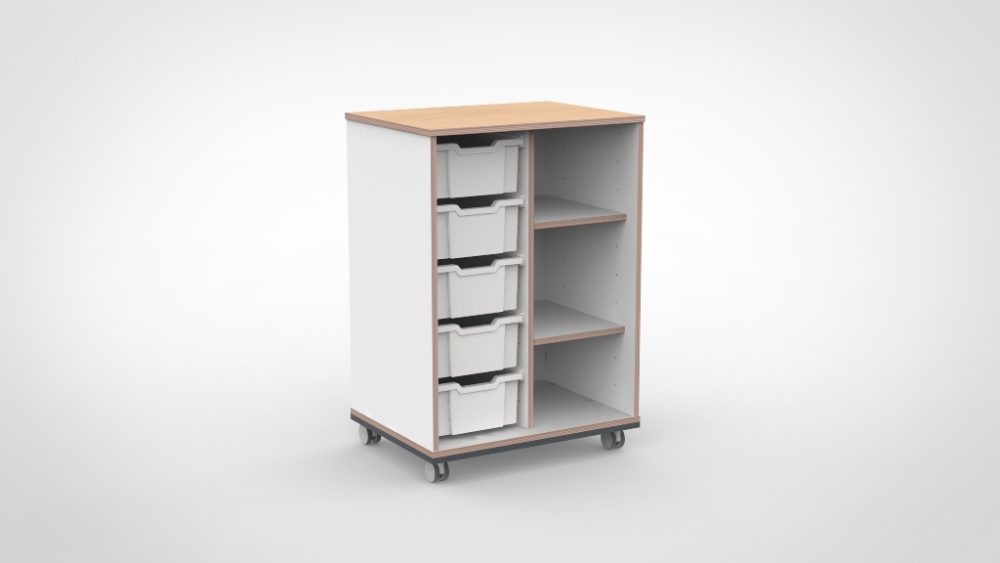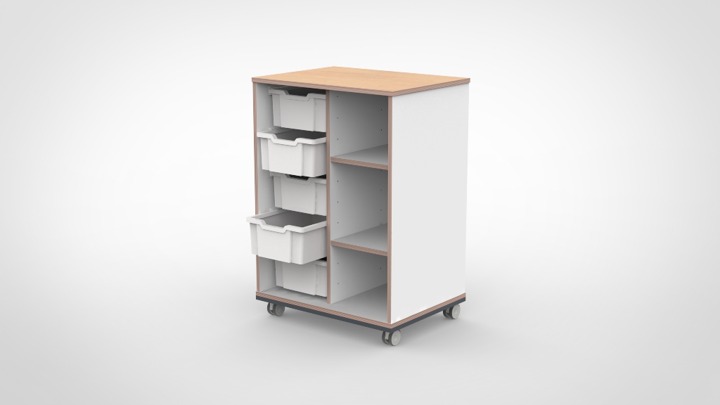Vervaardigd uit 18 mm dik meubelpaneel met slijtvaste melamine afwerking. Alle randen zijn voorzien van een 2 mm ABS-afwerking die stoot- en slijtvast is. Deuren zijn voorzien van zachtsluitende scharnieren. Het meubel voldoet aan de geldende veiligheidsnormen voor gebruik in de kinderopvang. Verkrijgbaar in negen houtdecors met een apart te kiezen kleur voor het bovenblad.