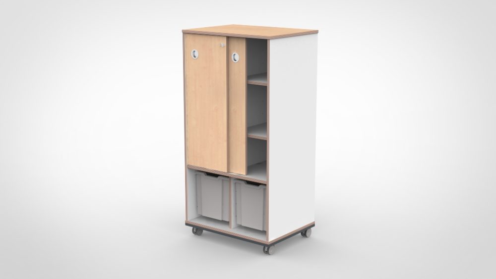 Tweekolomskast met open vakken onderin en gesloten deuren bovenin. De klassieke tweedeling: kinderen pakken zelfstandig uit de open vakken, materiaal bovenin blijft uit het zicht.