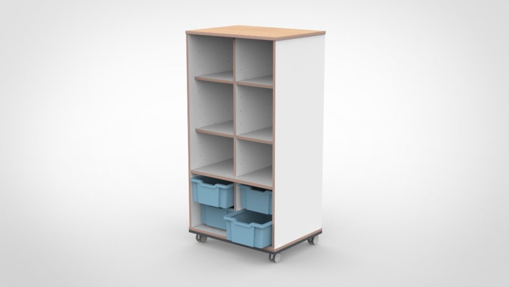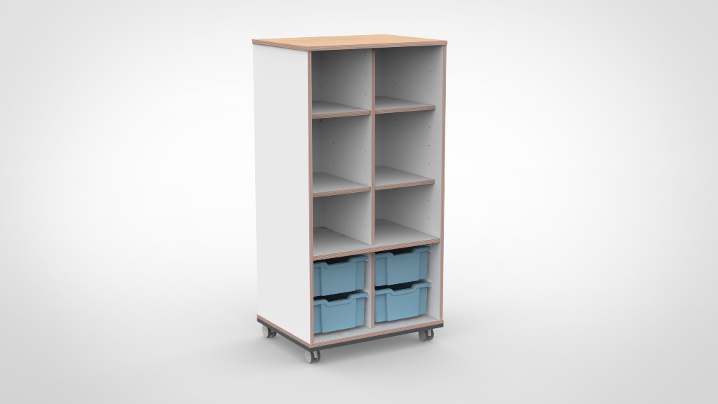 Vervaardigd uit 18 mm dik meubelpaneel met slijtvaste melamine afwerking. Alle randen zijn voorzien van een 2 mm ABS-afwerking die stoot- en slijtvast is. Deuren zijn voorzien van zachtsluitende scharnieren. Het meubel voldoet aan de geldende veiligheidsnormen voor gebruik in de kinderopvang. Verkrijgbaar in negen houtdecors met een apart te kiezen kleur voor het bovenblad.