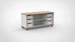 Een 4-kolomskast met kleine witte uitneembare bakken links en ruime open vakken rechts — overzichtelijk ingedeeld en direct toegankelijk voor peuters en kleuters. Op de comfortabele staande spelhoogte van 67,5 cm nodigt de bovenkant uit tot actief, vrij spel.