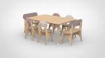 Alle onderdelen zijn vervaardigd uit berkenmultiplex met een blanke lakafwerking. De tafel heeft een slijtvast HPL-bovenblad in een decor naar keuze en massieve houten poten. Stoeltjes en bankje zijn glad afgewerkt zonder scherpe randen of hoeken. Robuuste constructie bestand tegen dagelijks intensief gebruik.