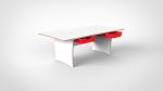 Wanneer er meer kinderen meedoen of wanneer het bouwproject gewoon groter mag zijn, biedt de rechthoekige bouwtafel de benodigde werkruimte. Twee centrale openingen verdelen het tafelblad in twee zones — elk met eigen materialen direct bij de hand — zodat ook bij een volle tafel niemand over het bouwwerk van een ander heen hoeft te reiken.