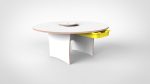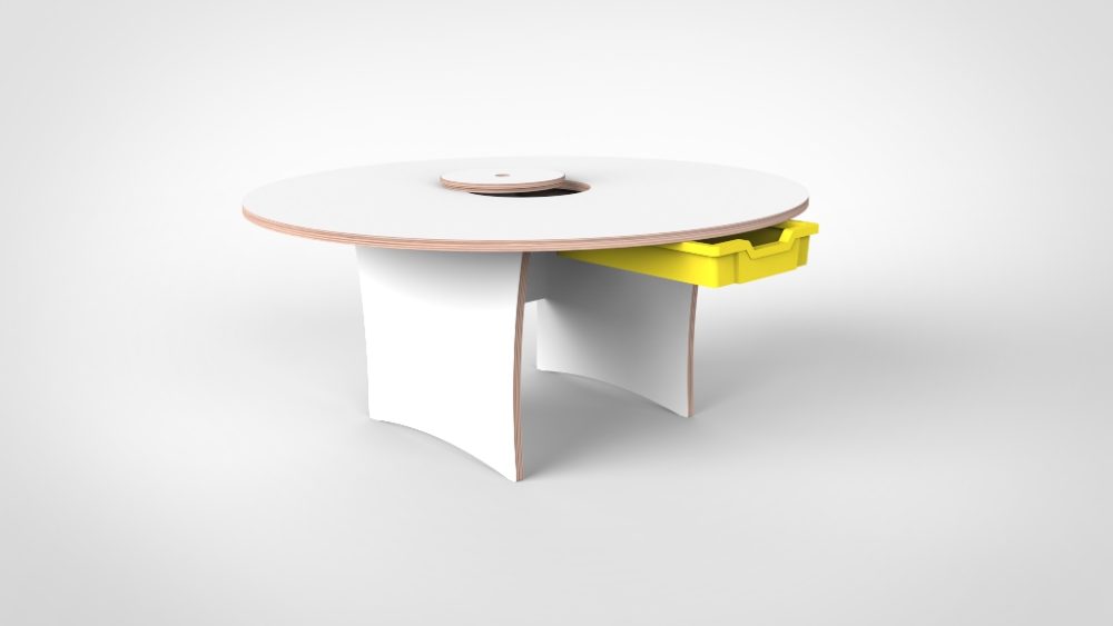 Een ronde tafel heeft geen hoofd en geen staart. Elk kind staat gelijkwaardig opgesteld en heeft vanuit zijn eigen positie direct zicht op het bouwwerk dat in het midden ontstaat — én op wat de anderen doen. De centrale opening in het blad geeft toegang tot de bouwmaterialen in het hart van de tafel: pakken, stapelen, opnieuw proberen. Open-ended play in zijn meest puurde vorm.