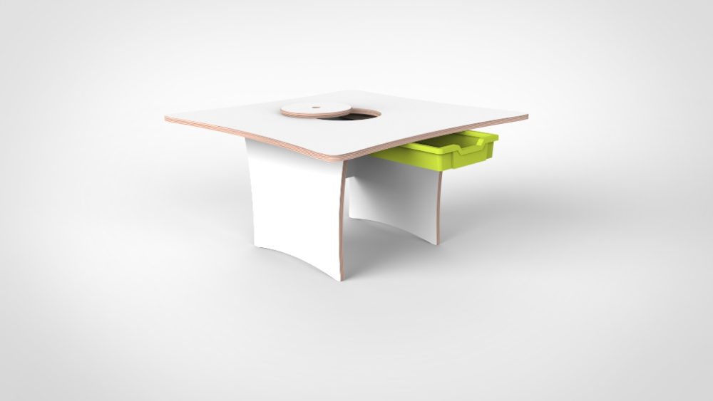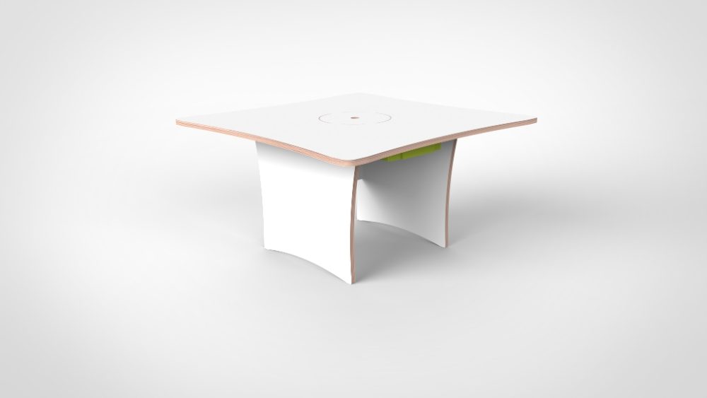 Vier gelijke zijden, vier gelijkwaardige plekken. De vierkante bouwtafel biedt een overzichtelijke werkruimte waar elk kind zijn eigen hoek heeft maar het gedeelde bouwwerk in het midden altijd zichtbaar en bereikbaar is. Compact genoeg voor een rustige speelhoek, krachtig genoeg voor groots constructiespel.