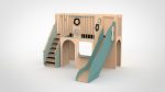 Het hogere platform van 110 cm vraagt meer van de motoriek en het zelfvertrouwen van kleuters — en dat is precies wat deze leeftijdsgroep prikkelt. De boogdoorgang beneden en het geïntegreerde winkeltje zorgen voor speelvariatie ook voor kinderen die even niet willen klimmen. De strakke rechthoekige lijnvorm en het verticale latten-hekwerk geven dit toestel een tijdloos, herkenbaar gezicht dat met eenvoudige aankleding elke gewenste sfeer aanneemt.