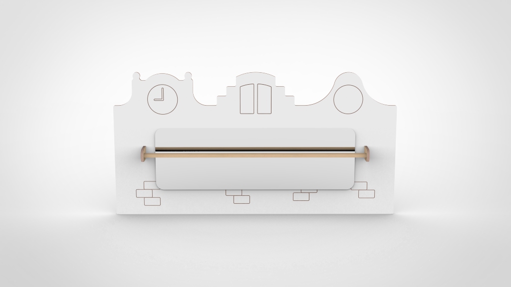 - Design: drie gevels met gegraveerde stenen