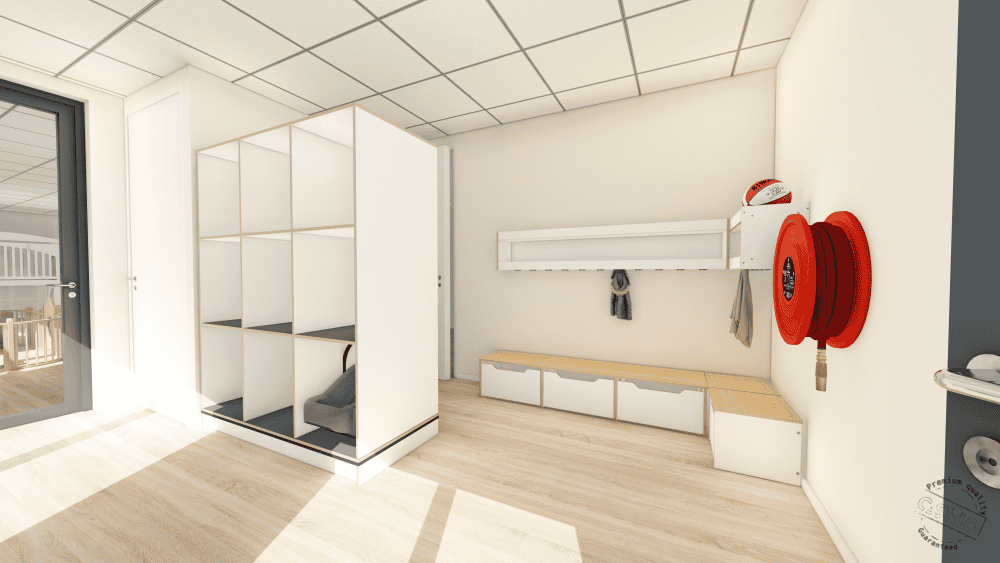 De kast is gemaakt van FSC-gecertificeerd berkenmultiplex in de Castilo werkplaats in Opmeer. De bodem van elk vak is bekleed met uitneembaar Flotex tapijt van Forbo. Flotex dempt het geluid wanneer een Maxi-Cosi wordt geplaatst of uitgenomen: geen gekletter of schrapen, maar een stille en soepele handeling. Dat is niet alleen prettig voor de begeleider, maar ook voor slapende kinderen en rustige momenten in de groep. Flotex is wasbaar, sneldrogend en hygiënisch, en beschermt de bekleding van het autostoeltje tegen slijtage en krassen. De inlegbodem is per vak eenvoudig uit te nemen voor reiniging.