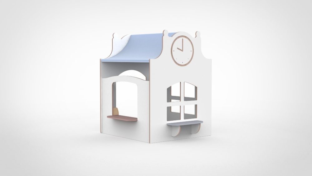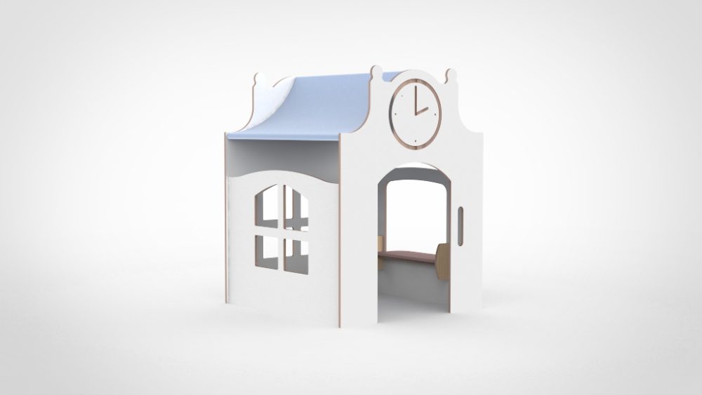 De klokgevel met klokelement roept bij kinderen direct associaties op met belangrijke gebouwen zoals een kerkje, stadhuis, school of station. Deze statige vorm stimuleert kinderen tot rustig, geconcentreerd spel waarbij ze thema’s als tijd, afspraken en samenwerking verkennen.