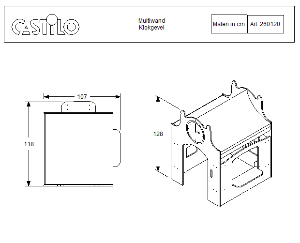 Het Multiwand Klokgevel laat zich uitstekend combineren met andere Castilo producten. Plaats tafeltjes en stoeltjes ervoor voor een schoolhoek, voeg een bureautje toe voor een kantoorhoek, of combineer met boekenkasten voor een rustige bibliotheek. Zo ontstaat een complete speelwereld die kinderen uitnodigt tot rustig en fantasierijk rollenspel.