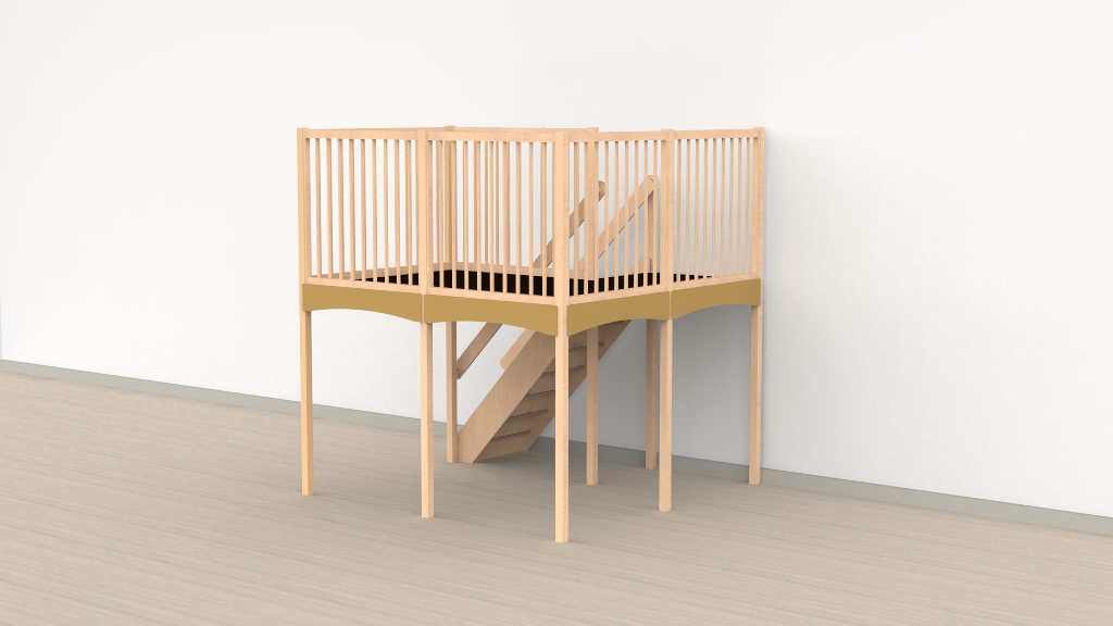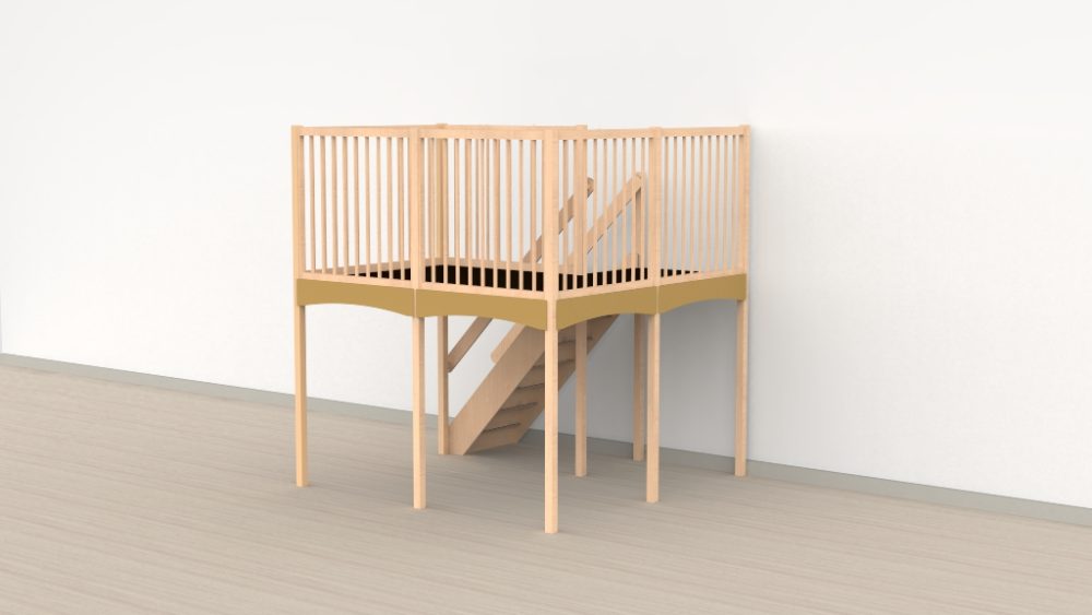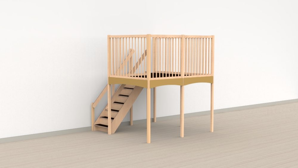 Trap linksachter combineert het beste van twee werelden: de voorzijde van de ruimte en de verdieping blijven vrij en overzichtelijk, terwijl de Oldschool-panelen rondom de verdieping kinderen een gevoel van eigen ruimte en geborgenheid geven. Ideaal voor locaties waarbij de voorzijde van de groepsruimte of het lokaal onbelemmerd toegankelijk moet blijven.