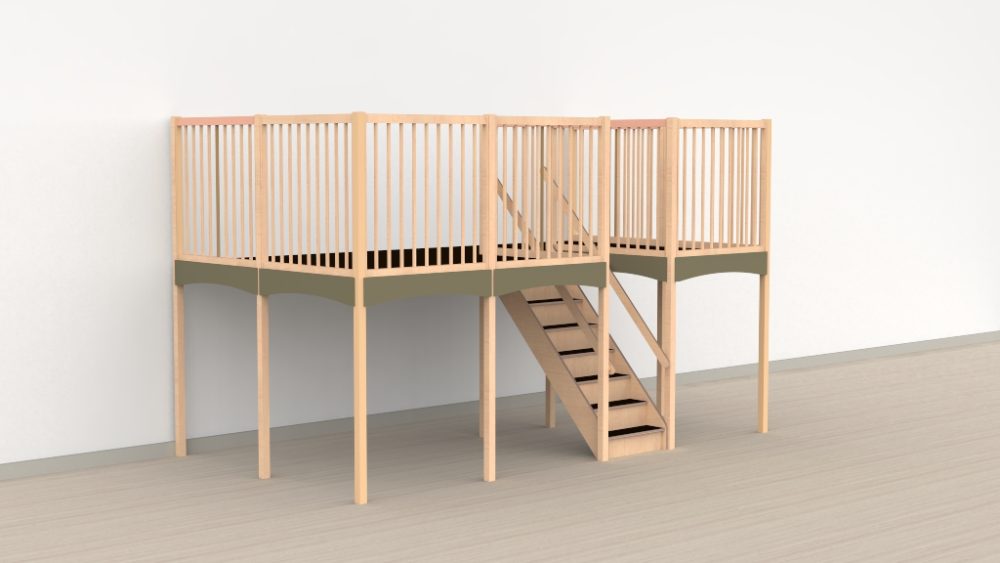U kunt kiezen uit drie vloerhoogtes te weten 140cm, 150cm en 160cm. De breedte en diepte zijn vrij invulbaar. De balustrade heeft een hoogte van 100cm en kan worden uitgevoerd met spijlen desgewenst in vrolijke kleuren of blank of in combinatie met panelen voorzien van plexiglas in verschillende kleuren. De kleur van de plint zoals afgebeeld is van de serie Buiten – B7.