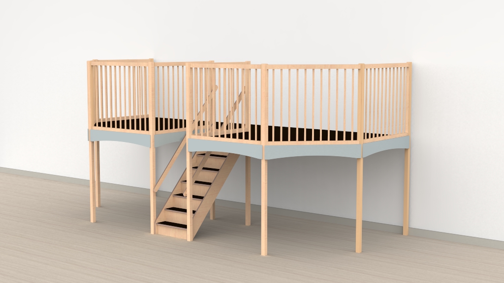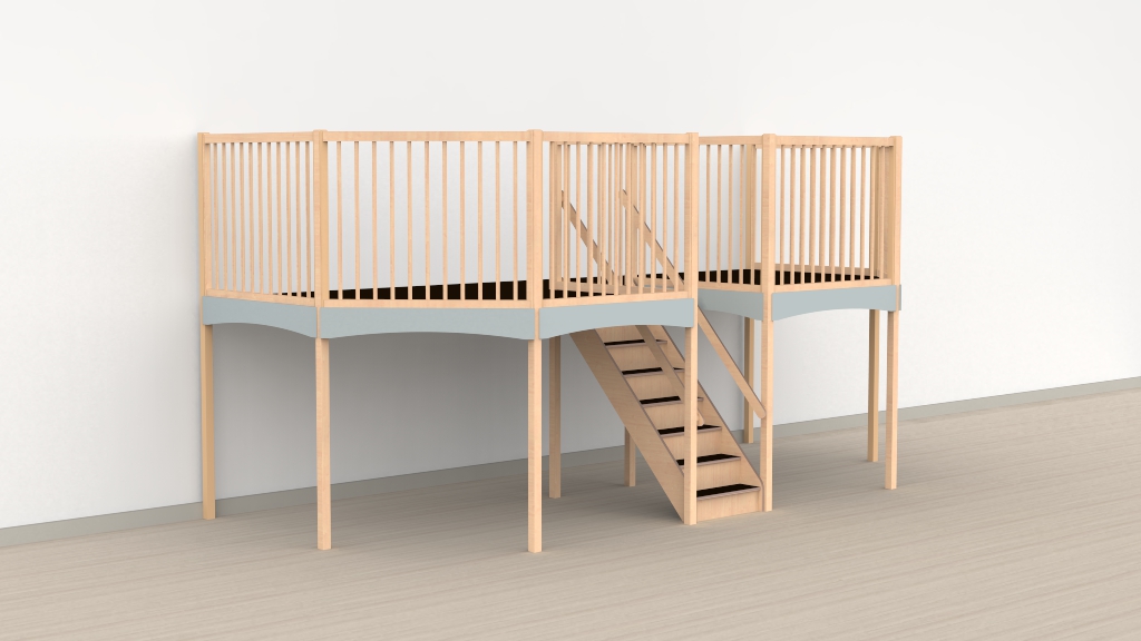 U kunt kiezen uit drie vloerhoogtes te weten 140cm, 150cm en 160cm. De breedte en diepte zijn vrij invulbaar. De balustrade heeft een hoogte van 100cm en kan worden uitgevoerd met spijlen desgewenst in vrolijke kleuren of blank of in combinatie met panelen voorzien van plexiglas in verschillende kleuren. De kleur van de plint zoals afgebeeld is uit de serie Lief – L22.