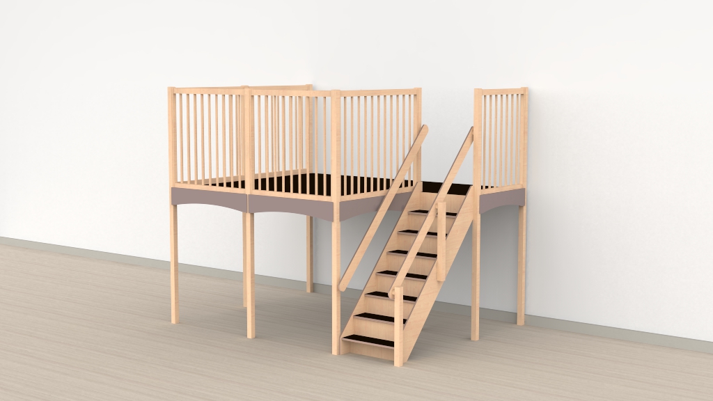 De Oldschool speelwerkverdieping met trap rechts benut de rechter zijde van uw ruimte als toegangsroute naar de verdieping, met de geborgen sfeer van de karakteristieke Oldschool-panelen.