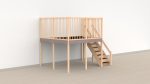 De Oldschool-panelen maken van de verdieping een herkenbare eigen plek voor kinderen — ongeacht de trappositie. De versie met trap rechts laat de linkerzijde van de ruimte onder de verdieping volledig vrij, terwijl de verdieping zelf door de panelen een intieme, uitnodigende sfeer krijgt.