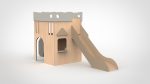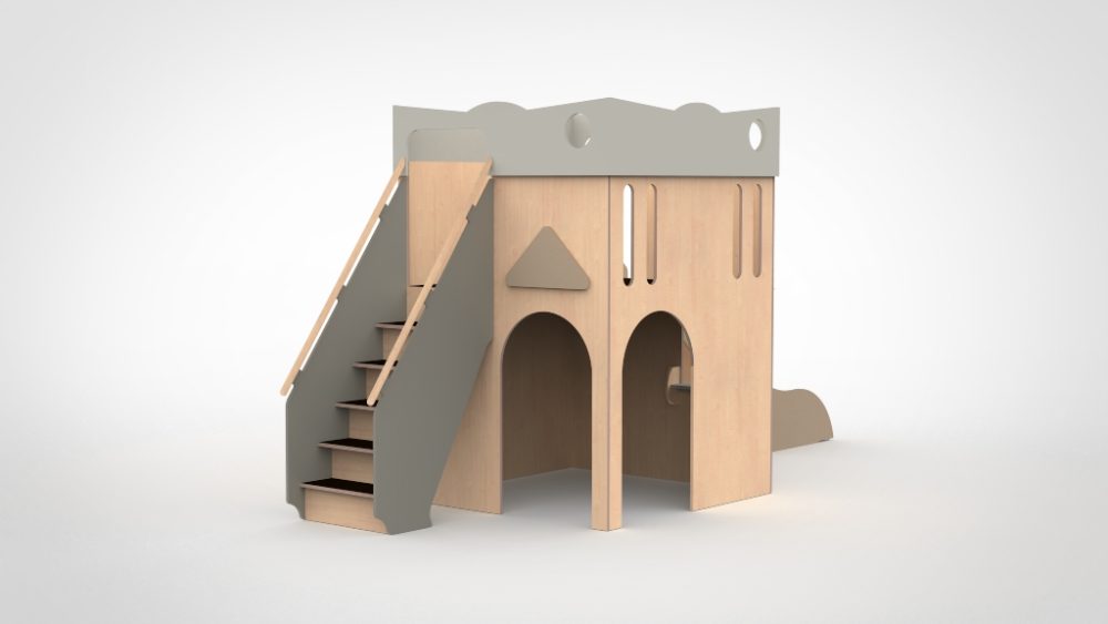 De Pico 95 lijnopstelling is een karaktervol speelhuisje met 95 cm platform, speelse getande dakrand en lange glijbaan — compact langs de wand, groot in speelplezier voor kleuters van 3 tot 6 jaar.
