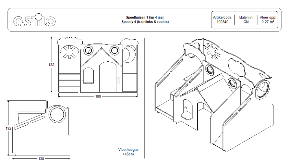 Geschikt voor kinderen van 1,5 tot 4 jaar. Leverbaar in een ruime kleurkeuze, rechts of links uitvoering. Speelhuisje inclusief afsluitbaar deurtje. Montage op begane grond inbegrepen, levering door heel Nederland.