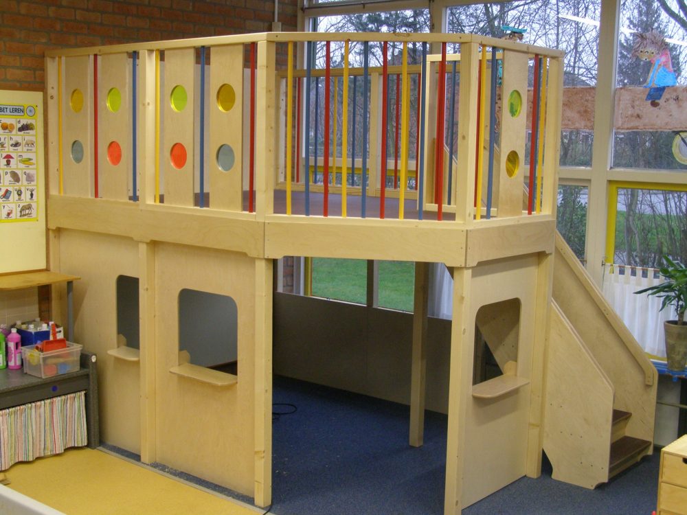 De Castilo speelwerkverdieping met trap rechtsachter plaatst de toegang naar de verdieping rechts achteraan — de voorzijde van de ruimte blijft volledig vrij en overzichtelijk.