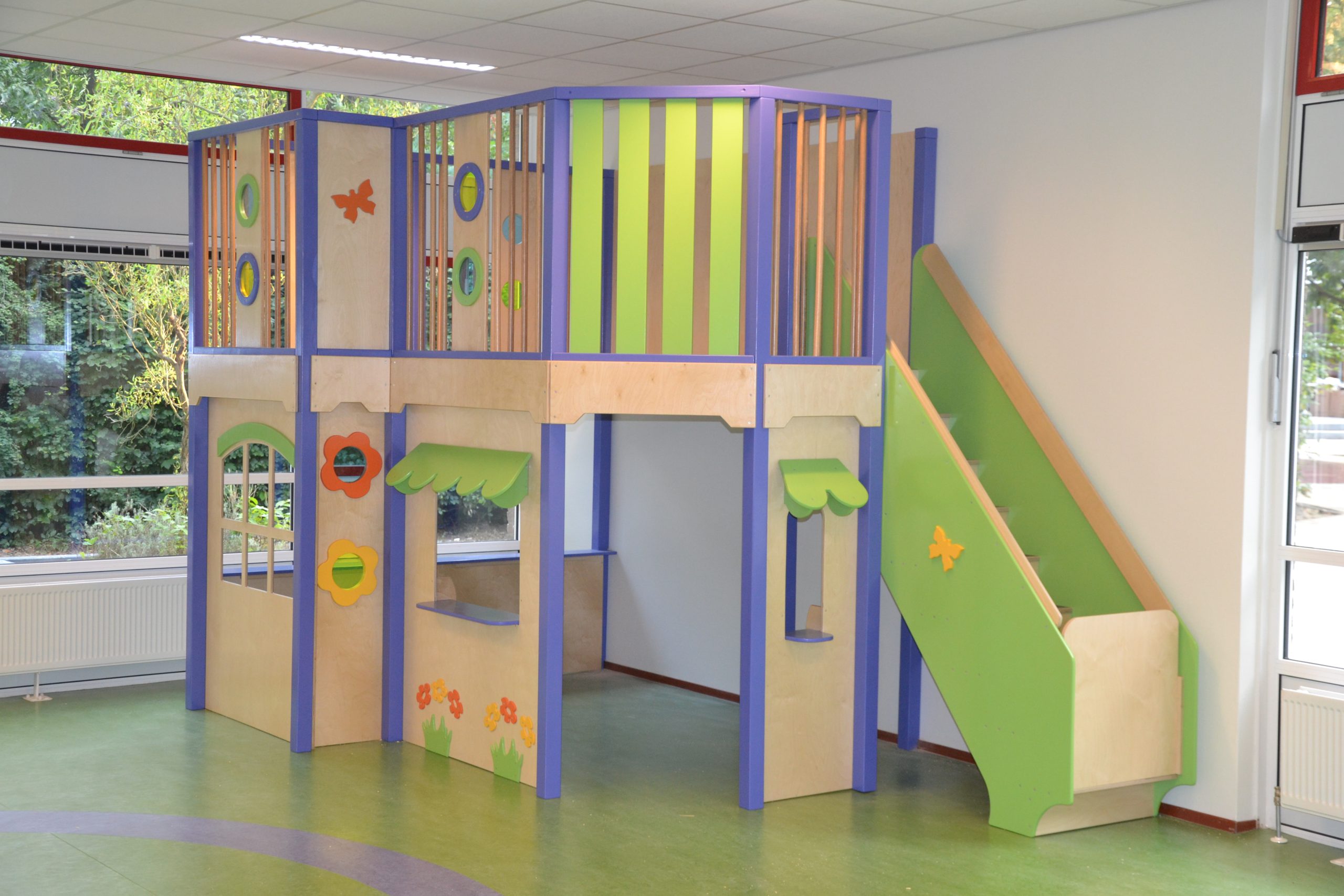 De Castilo speelwerkverdieping met trap rechtsachter plaatst de toegang naar de verdieping rechts achteraan — de voorzijde van de ruimte blijft volledig vrij en overzichtelijk.