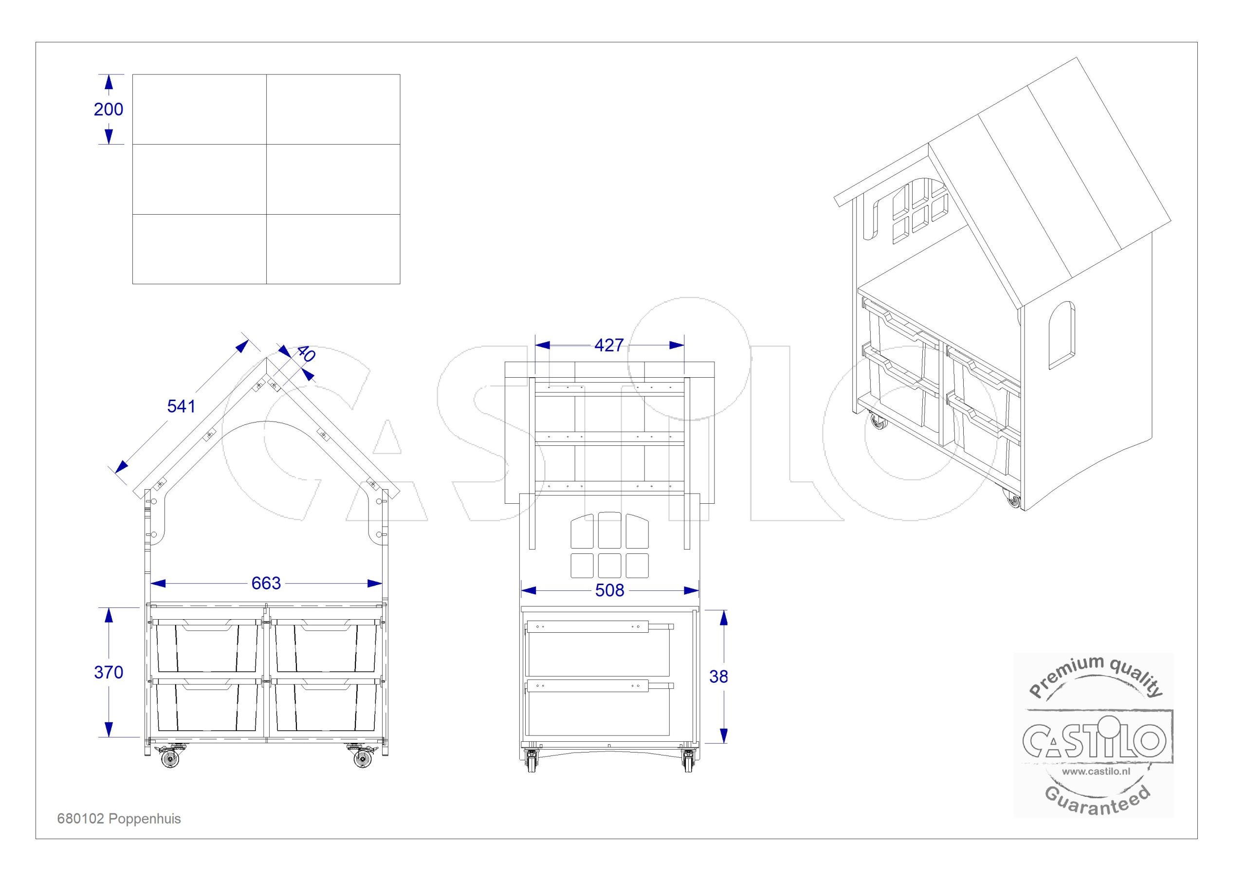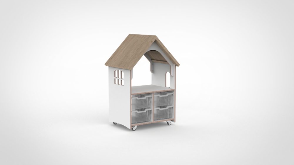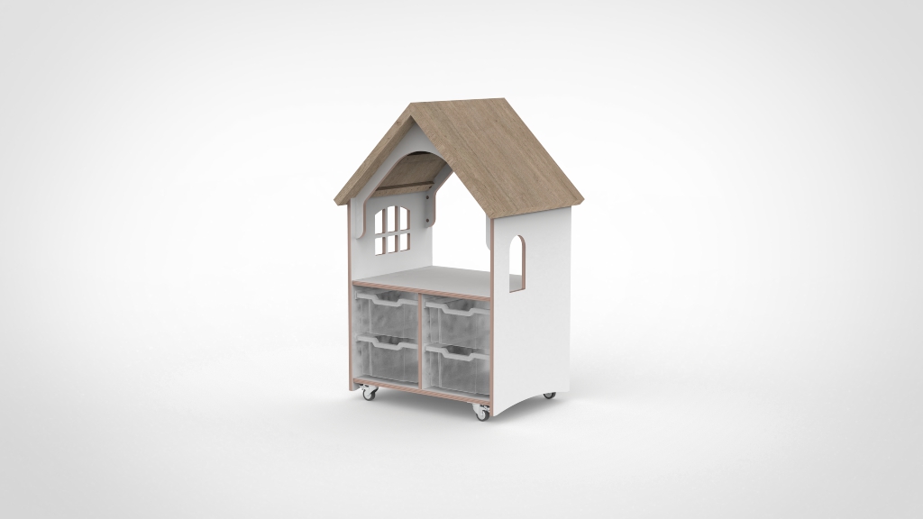 Het Castilo verrijdbare poppenhuis is een compleet rollenspelmeubel met twee verdiepingen en een karakteristiek houtdecor dakje. De open voorkant nodigt kinderen uit tot vrij, creatief spel — een uitgelezen open-einde speelplek op de perfecte staande spelhoogte. Inclusief vier transparante opbergbakken onder het huis. Vervaardigd uit 18mm berkenmultiplex met slijtvaste HPL-afwerking.