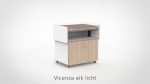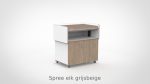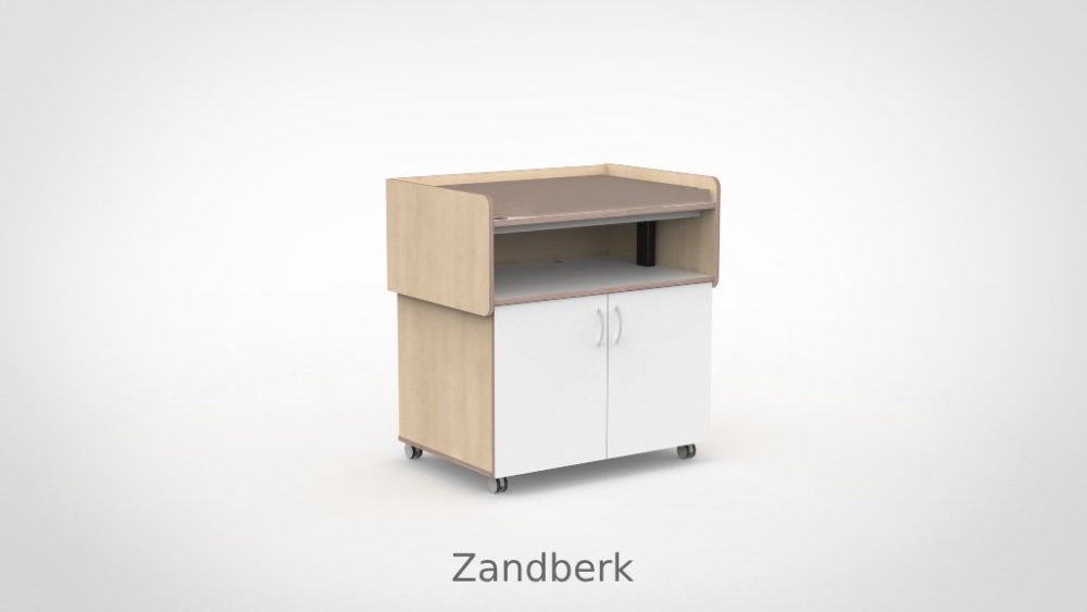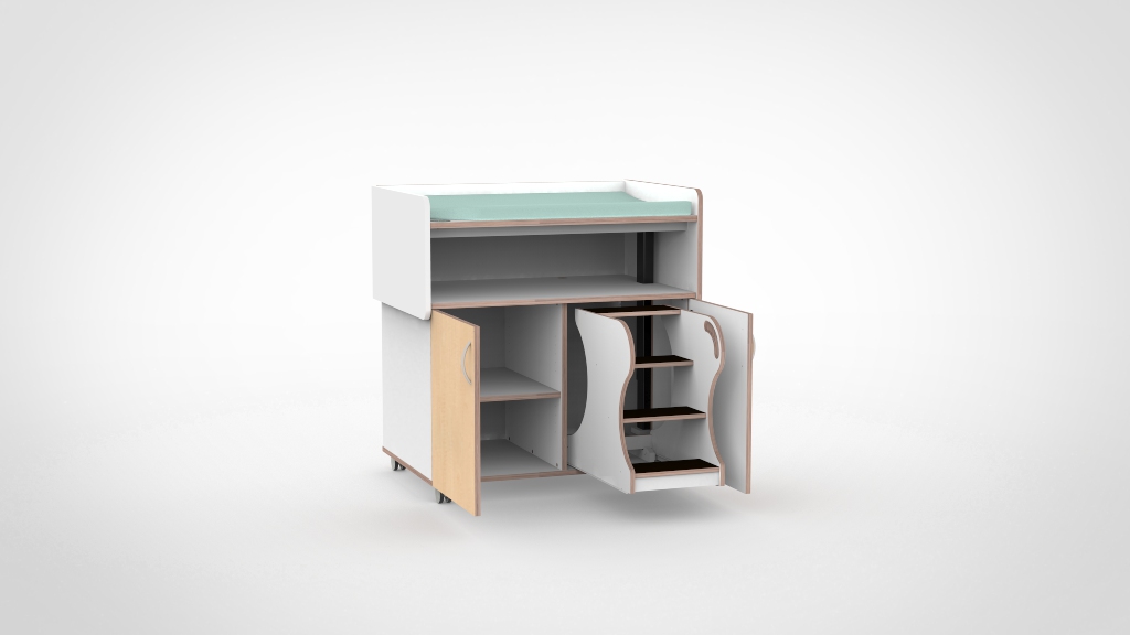 Soms is er geen vaste verschoonruimte, of wisselt de indeling regelmatig. De verrijdbare commode 100 cm past door smallere doorgangen en is eenvoudig te verplaatsen naar de plek waar die op dat moment het meest nodig is. Het touchpaneel met LED-display en kinderslot zit bevestigd onder het blad; tot drie persoonlijke werkhoogtes zijn instelbaar. De opbergruimte achter de deuren houdt luiers, verzorgingsproducten en schone kleding overzichtelijk bij de hand, ook onderweg.