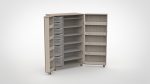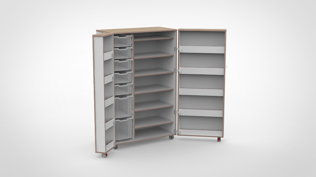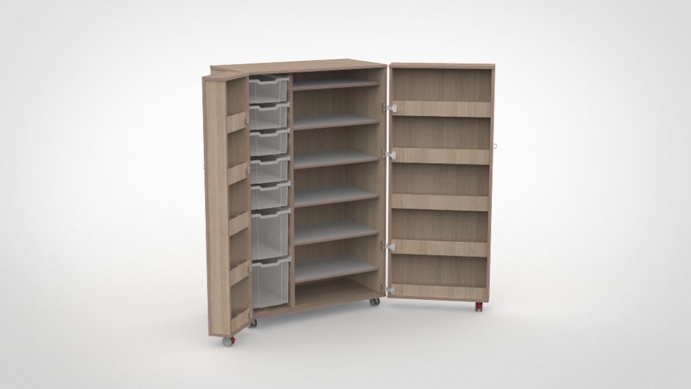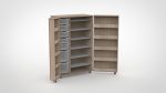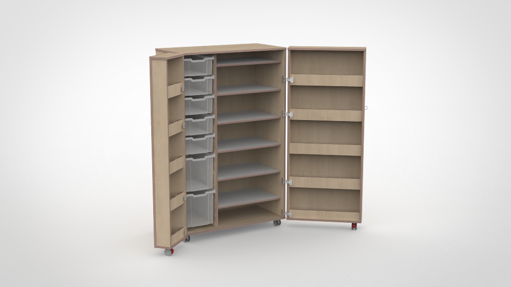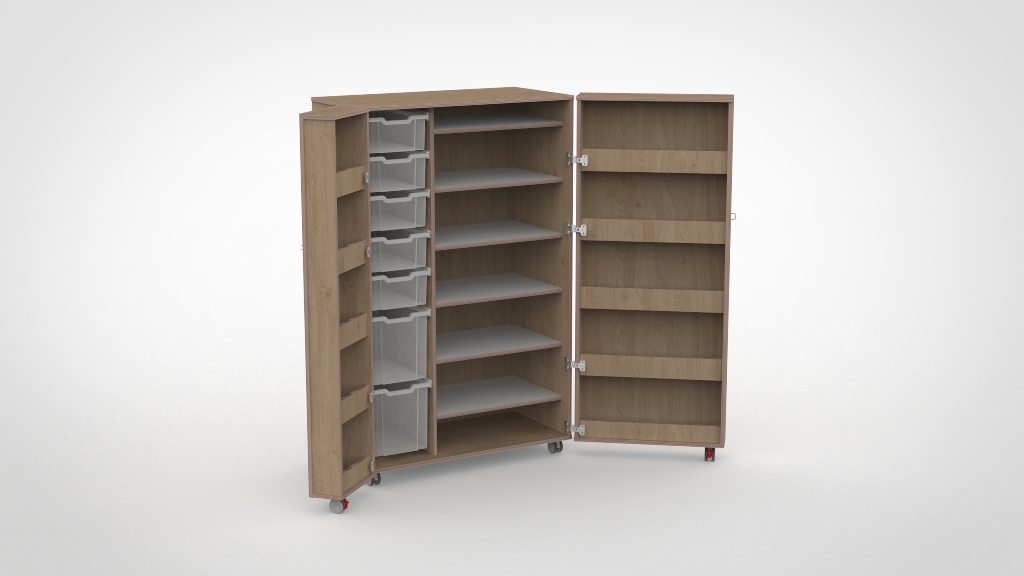 Het bijzondere aan onze vouwkasten is dat ook de deuren opbergruimte bieden. Door de opgedekte deuren ontstaan extra vakken aan de binnenzijde, ideaal voor verfpotjes, kwasten, scharen en ander materiaal dat u snel bij de hand wilt hebben. Gecombineerd met Gratnell lades in de kast zelf heeft elk knutselmateriaal, spelletje of lesmateriaal een eigen, overzichtelijke plek.