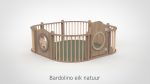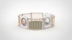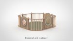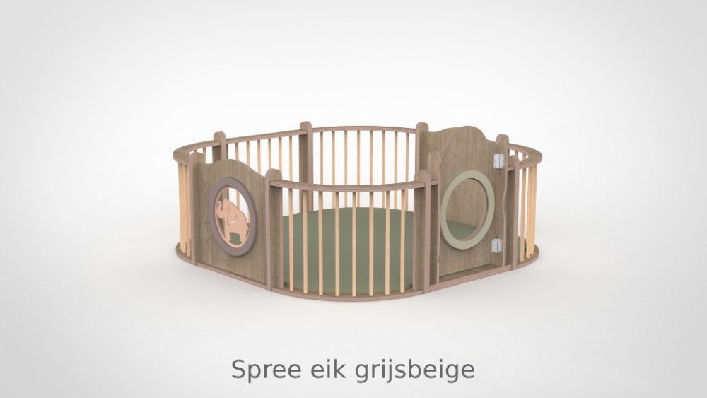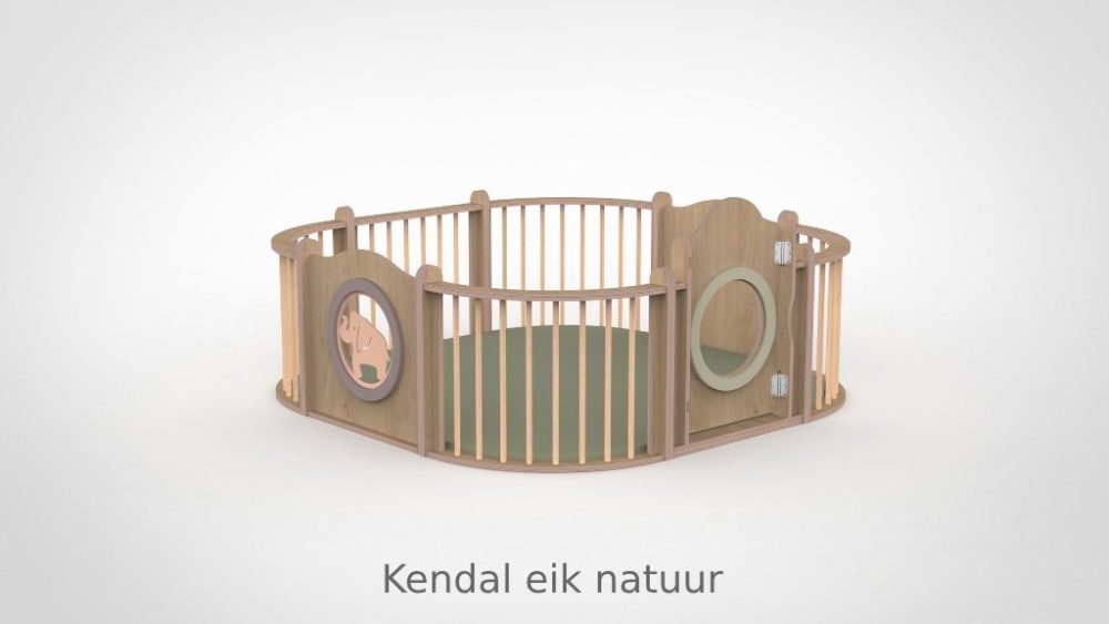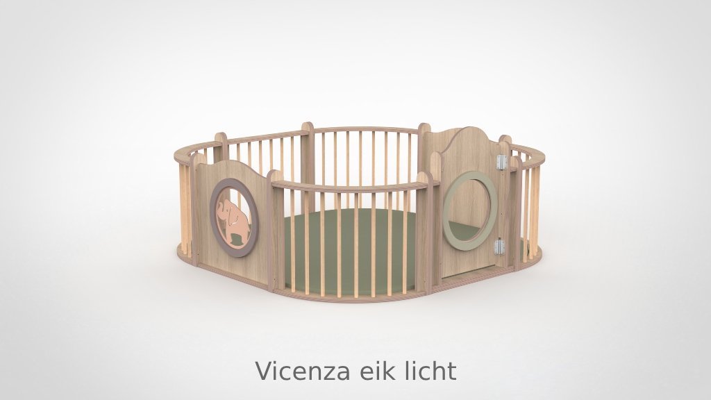 De panelen zijn opgebouwd uit 15 mm berken multiplex met aan beide kanten een slijtvast HPL in wit of in een van de 8 beschikbare houtdecors. De decoratieve ringen in de panelen zijn verkrijgbaar in meer dan 30 kleuren, gespoten in onze eigen spuiterij — zo stemt u de grondbox perfect af op de uitstraling van uw groepsruimte. De ronde kijkgaten zijn voorzien van transparant plexiglas, veilig en kindvriendelijk. Alle panelen zijn ontworpen met het voorkomen van beknelling van hoofd en vingers als uitgangspunt. De ondergrond mag gewoon de vloer zijn: baby’s kunnen zich hier het beste tegen afzetten om te oefenen in allerlei posities. Optioneel levert Castilo een mat op maat, vervaardigd in ons eigen stoffeeratelier uit hoogwaardig kunstleder — ademend, waterdicht en slijtvast — in talloze kleuren en materialen.