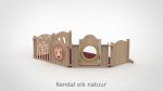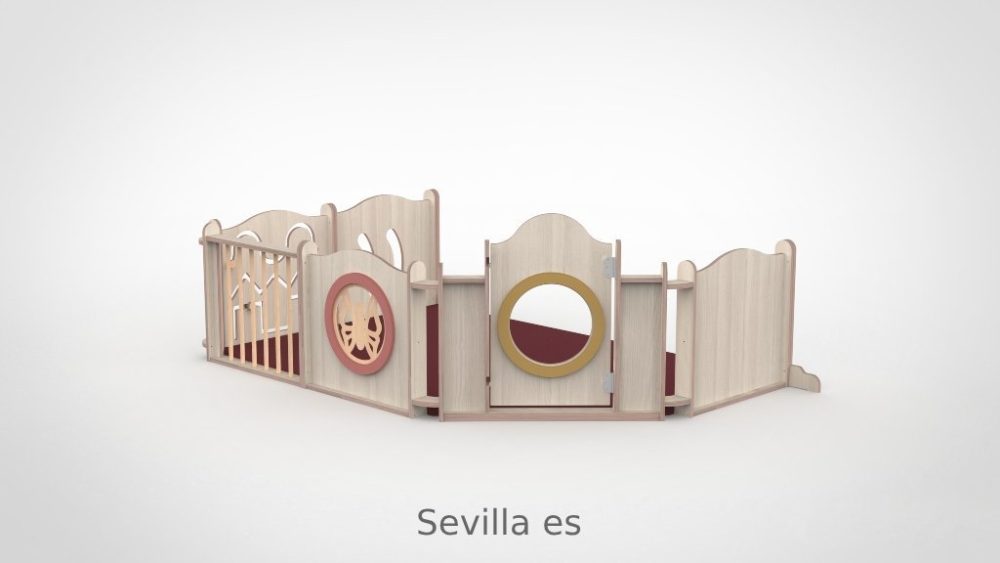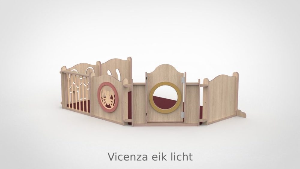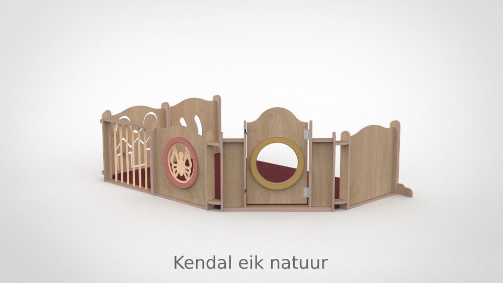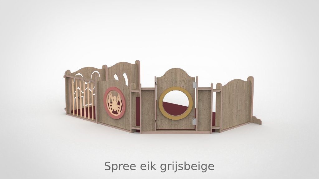 De panelen zijn opgebouwd uit 15 mm berken multiplex met aan beide kanten een slijtvast HPL in wit of in een van de 8 beschikbare houtdecors. De decoratieve ringen in de panelen zijn verkrijgbaar in meer dan 30 kleuren, gespoten in onze eigen spuiterij — zo stemt u de grondbox perfect af op de uitstraling van uw groepsruimte. De ronde kijkgaten zijn voorzien van transparant plexiglas, veilig en kindvriendelijk. Alle panelen zijn ontworpen met het voorkomen van beknelling van hoofd en vingers als uitgangspunt. De ondergrond mag gewoon de vloer zijn: baby’s kunnen zich hier het beste tegen afzetten om te oefenen in allerlei posities. Optioneel levert Castilo een mat op maat, vervaardigd in ons eigen stoffeeratelier uit hoogwaardig kunstleder — ademend, waterdicht en slijtvast — in talloze kleuren en materialen.